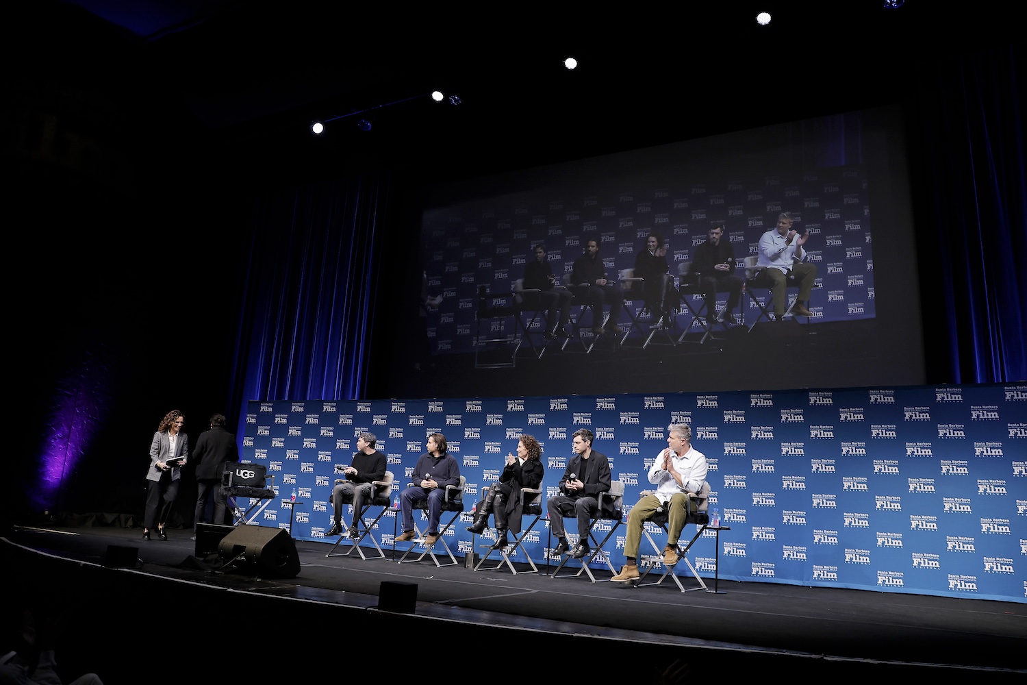 SANTA BARBARA, CALIFORNIA - FEBRUARY 08: (L-R) Anne Thompson, Joslyn Barnes, Clint Bentley, Jesse Eisenberg, Mona Fastvold, Tim Fehlbaum and Peter Straughan speak onstage at the writers panel at the 40th Santa Barbara International Film Festival on February 08, 2025 in Santa Barbara, California. (Photo by Tibrina Hobson/Getty Images for Santa Barbara International Film Festival)