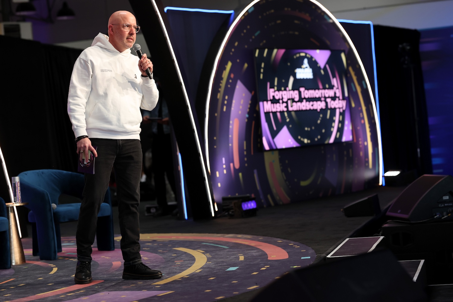 LOS ANGELES, CALIFORNIA - JANUARY 29: Miles Minnick speaks onstage during Forging Tomorrow's Music Landscape Today at GRAMMY House during the 68th GRAMMY Awards at Rolling Greens on January 29, 2026 in Los Angeles, California. (Photo by Monica Schipper/Getty Images for The Recording Academy)