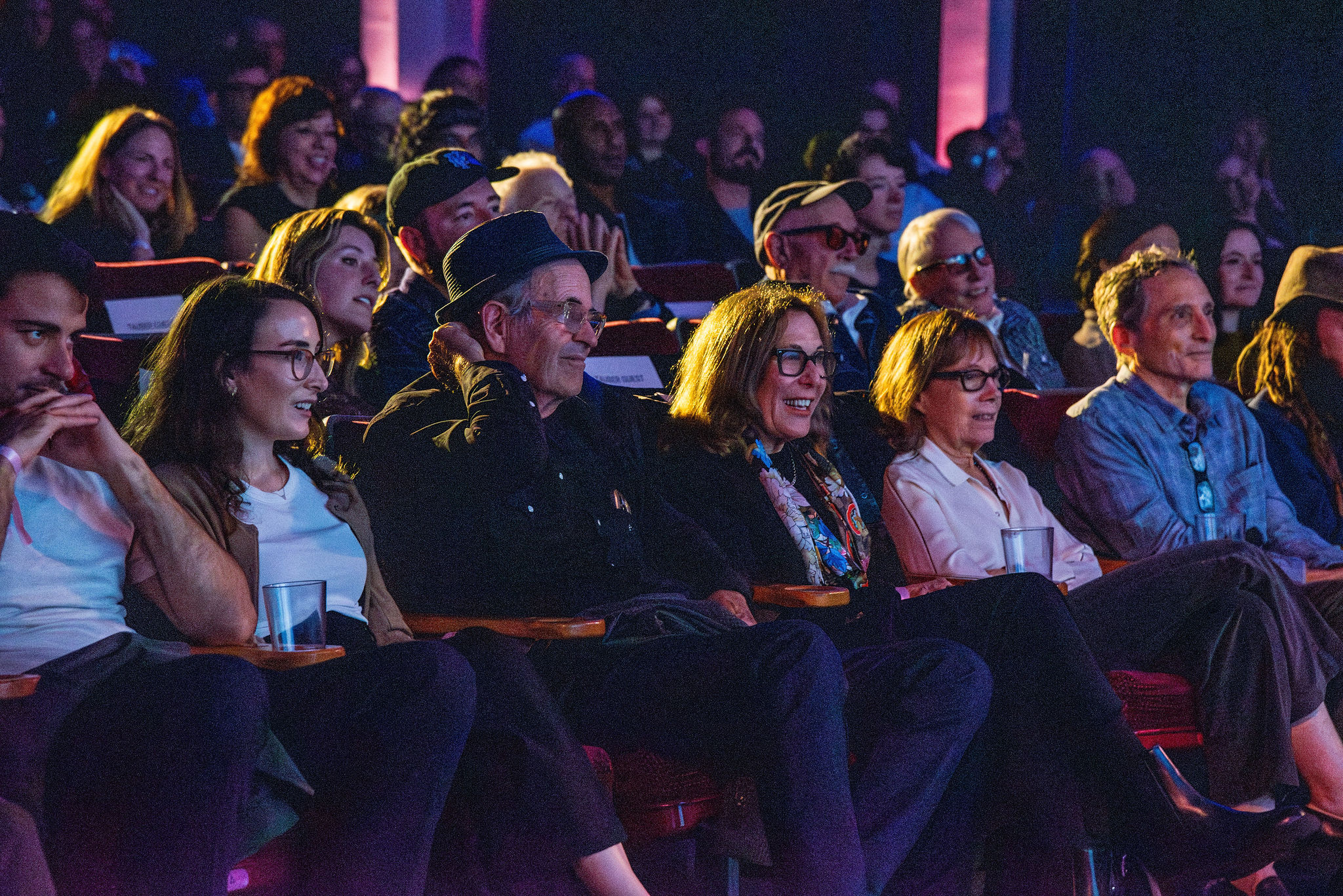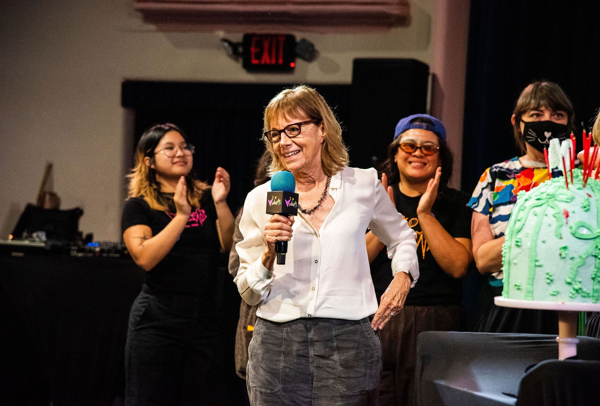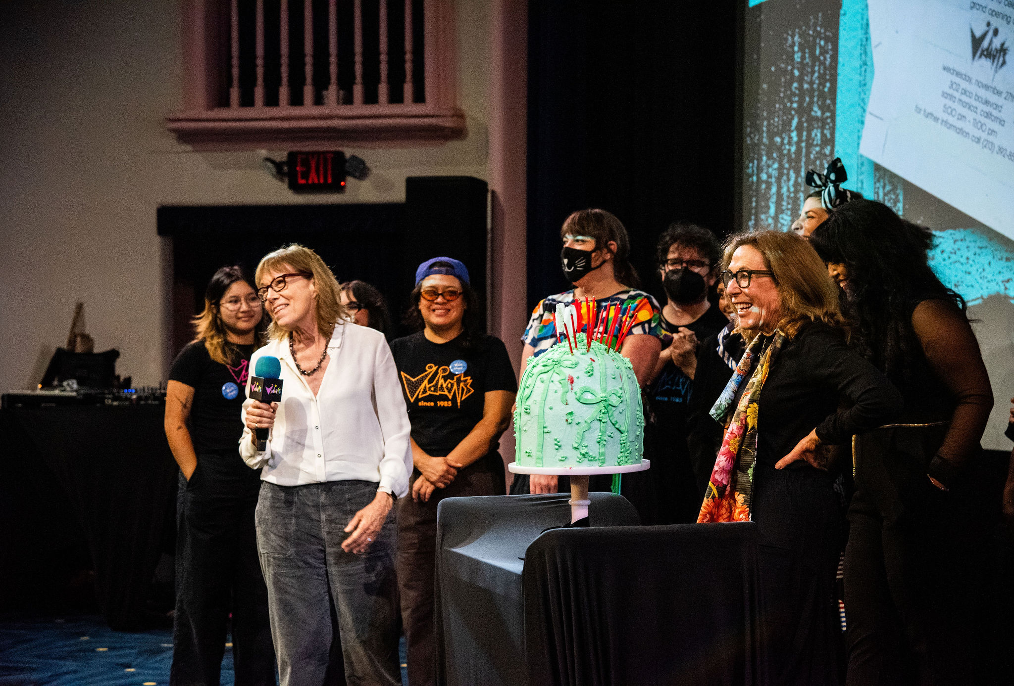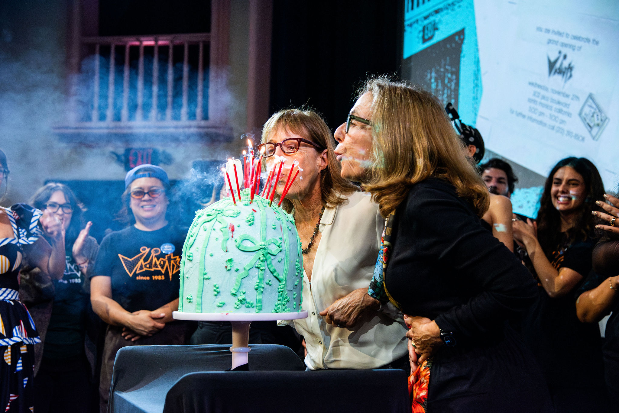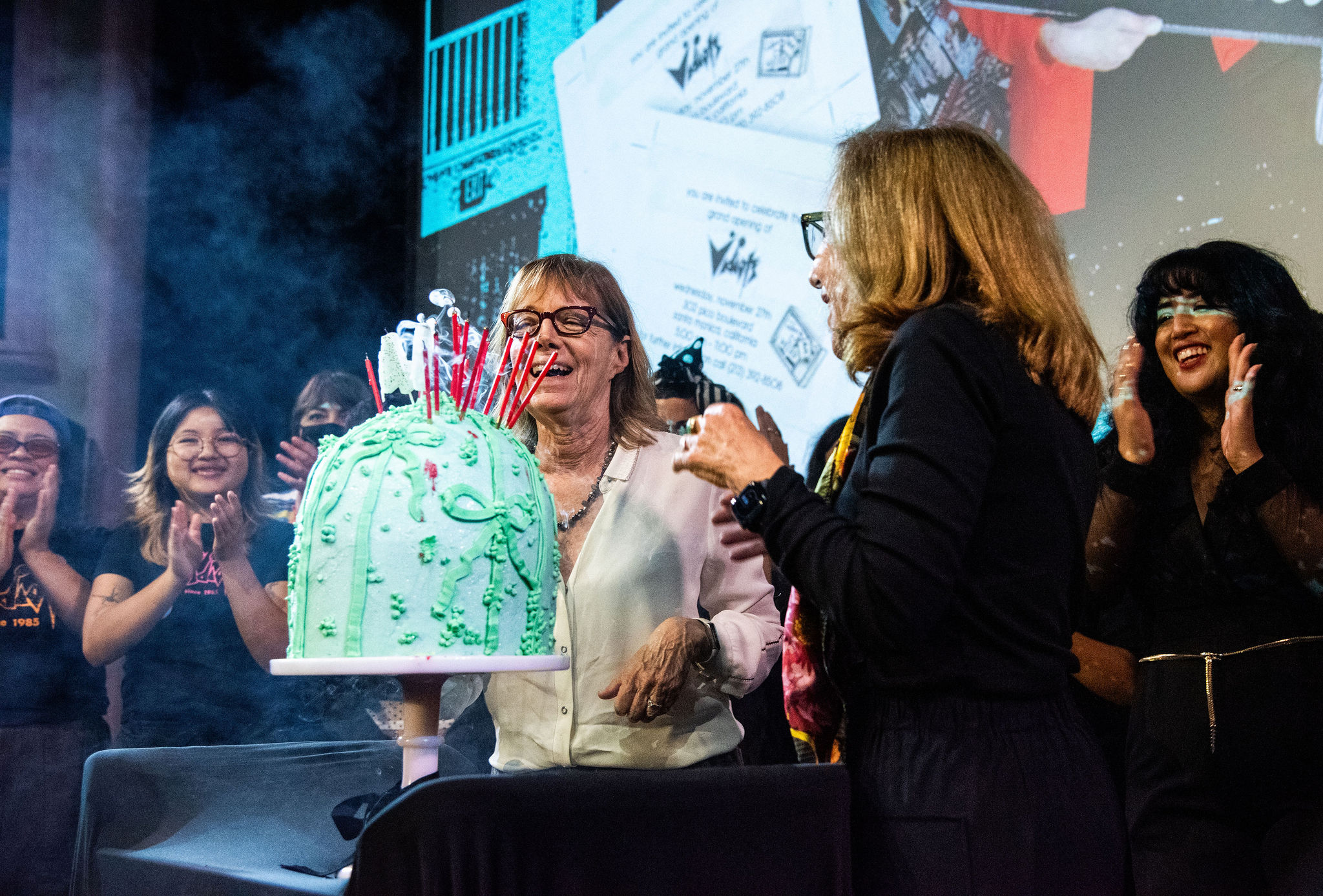The program closed with an emotional tribute. Executive Director Maggie Mackay, brought Founders Cathy Tauber and Patty Polinger, and the full Vidiots team onstage to be honored for sustaining a cultural institution that has raised generations of movie lovers. A birthday cake covered in candles appeared, and the entire theater sang “Happy Birthday” to Vidiots.