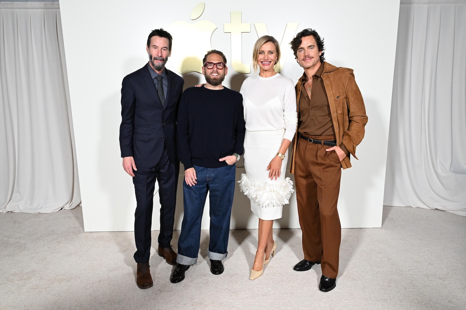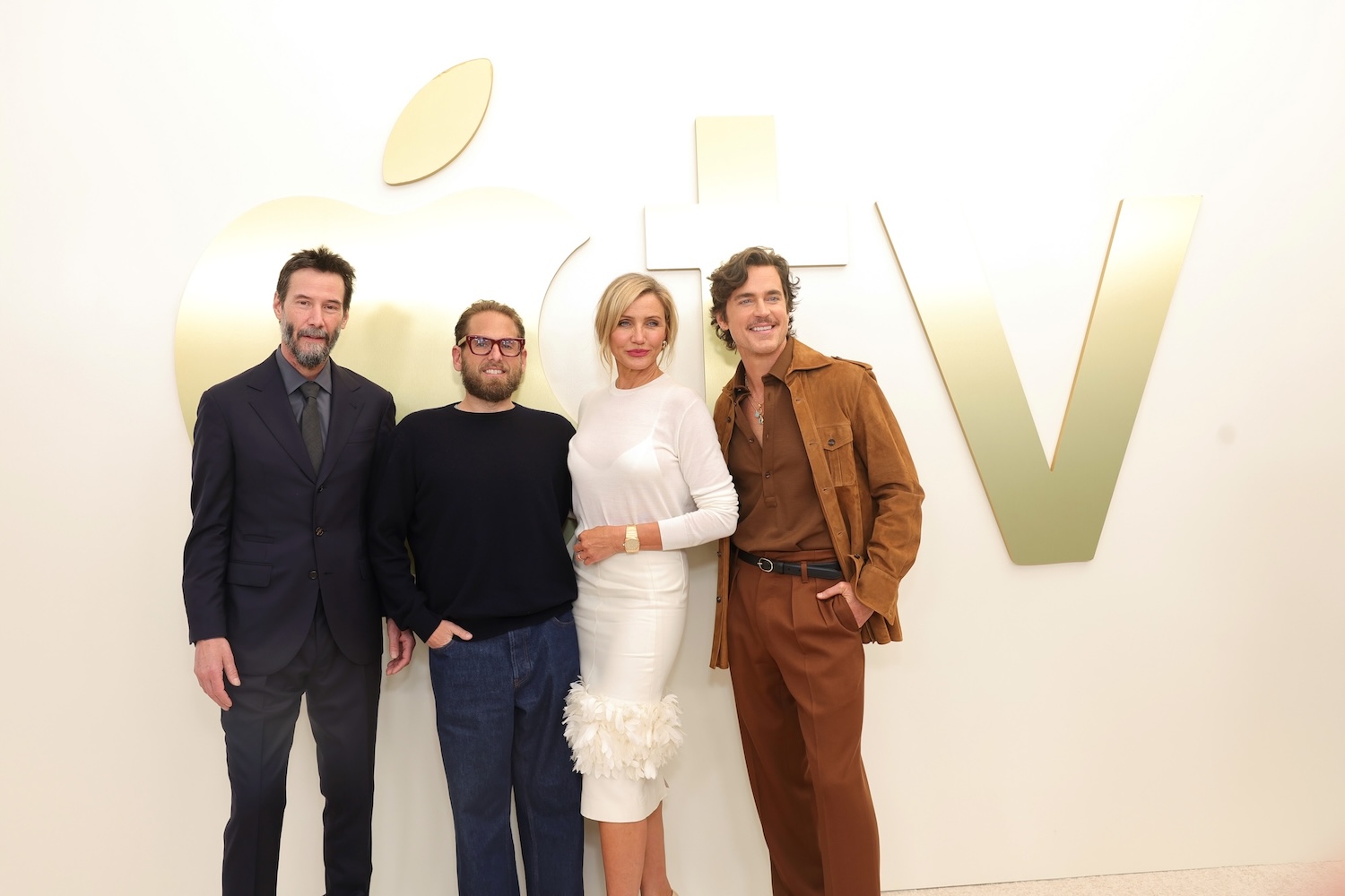 SANTA MONICA, CALIFORNIA - FEBRUARY 03: (L-R) Keanu Reeves, co-writer/director/producer Jonah Hill, Cameron Diaz and Matt Bomer, from Apple's film “ Outcome,” at the Apple TV Press Day at the Barker Hangar on February 03, 2026 in Santa Monica, California. The star-studded event highlighted a stellar lineup of original series and films coming to Apple TV in 2026. (Photo by Stewart Cook/Apple TV via Getty Images)