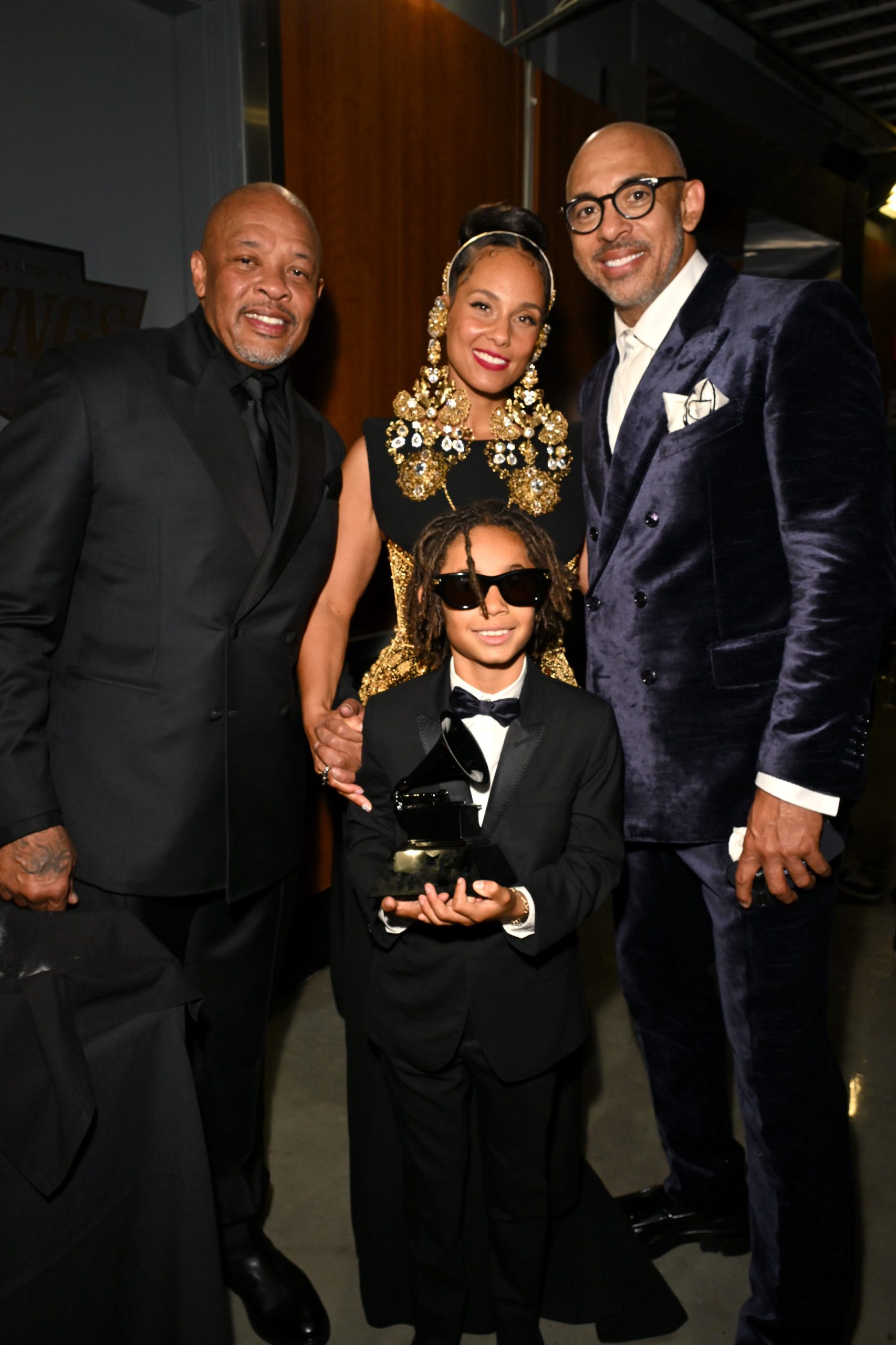 LOS ANGELES, CALIFORNIA - FEBRUARY 02: (L-R) Dr. Dre, Alicia Keys, Genesis Ali Dean and Harvey Mason Jr., CEO, MusicCares & Recording Academy attend the 67th Annual GRAMMY Awards at Crypto.com Arena on February 02, 2025 in Los Angeles, California. (Photo by Lester Cohen/Getty Images for The Recording Academy)