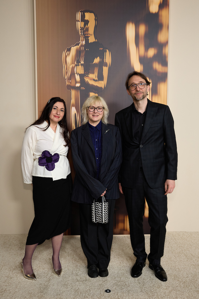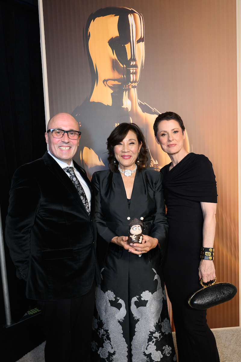 Academy President Janet Yang with Adam Elliot and Liz Kearney at the 97th Oscars Nominees dinner at the Academy Museum of Motion Pictures on Tuesday, February 25, 2025.
