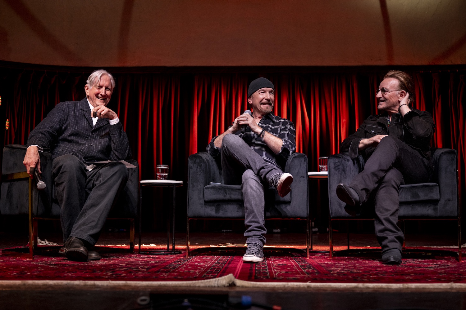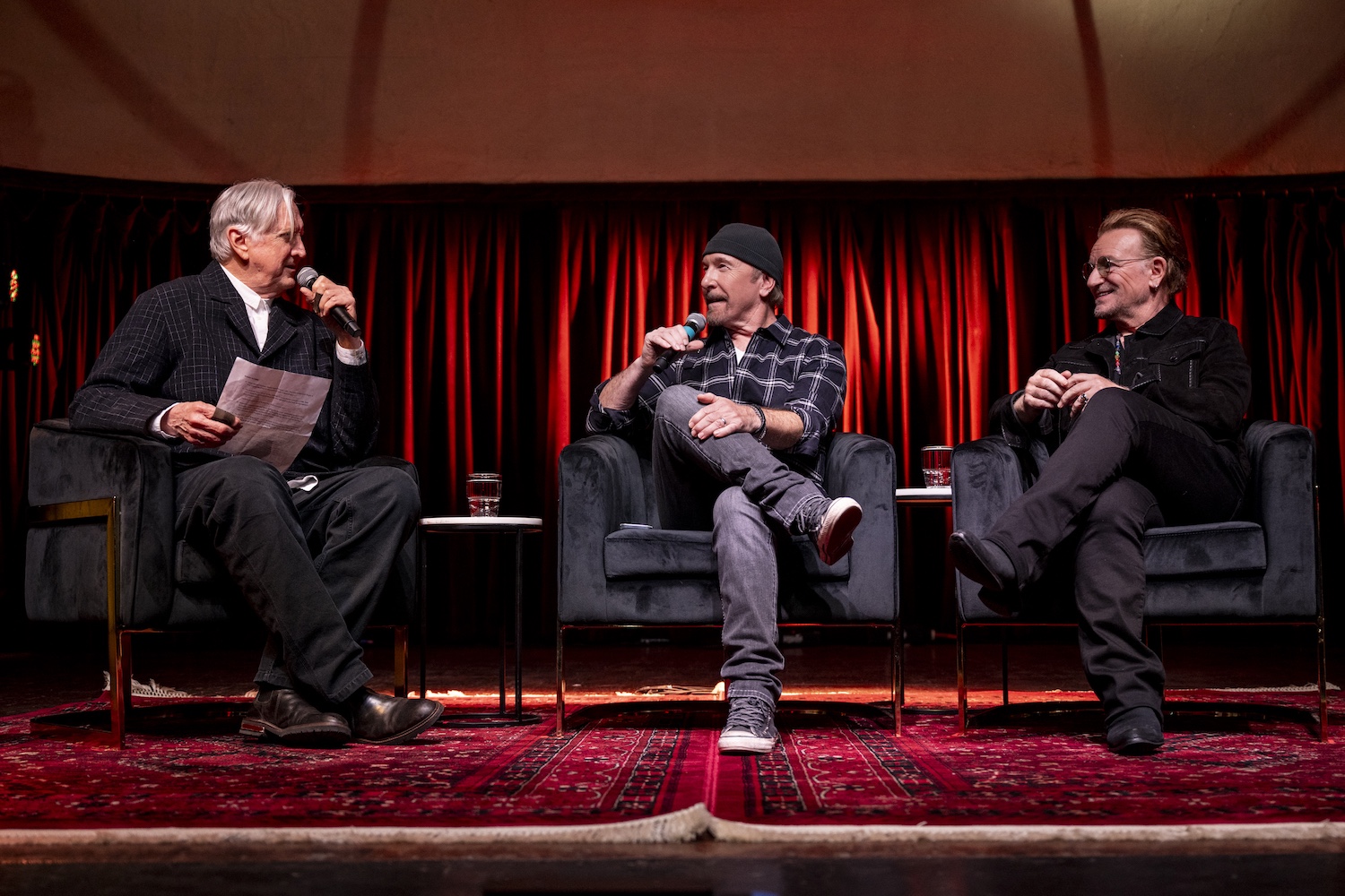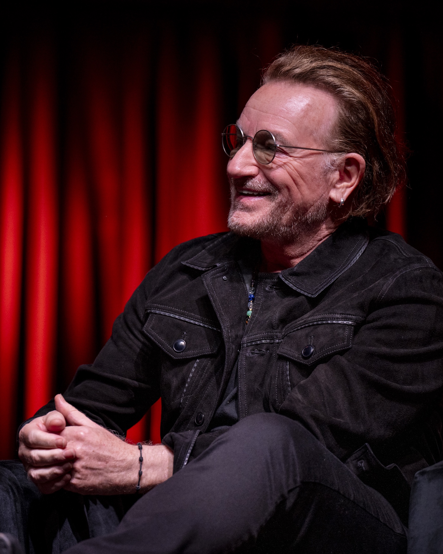 When speaking with T Bone about the songwriting process relative to protest songs, Bono and Edge both spoke about needing to be moved. Bono said, “you can’t write a song to order.” He elaborated with a surprise to the audience by reading lyrics to a song that is a work in progress, written about the killing of Awdah Hathaleen, the Palestinian activist and consultant on the Oscar-winning documentary “No Other Land” murdered in July 2025 by an Israeli settler. It’s been widely reported that U2 is in the studio working on new music and this was the first glimpse of any content. Bono cited lyrics that began: