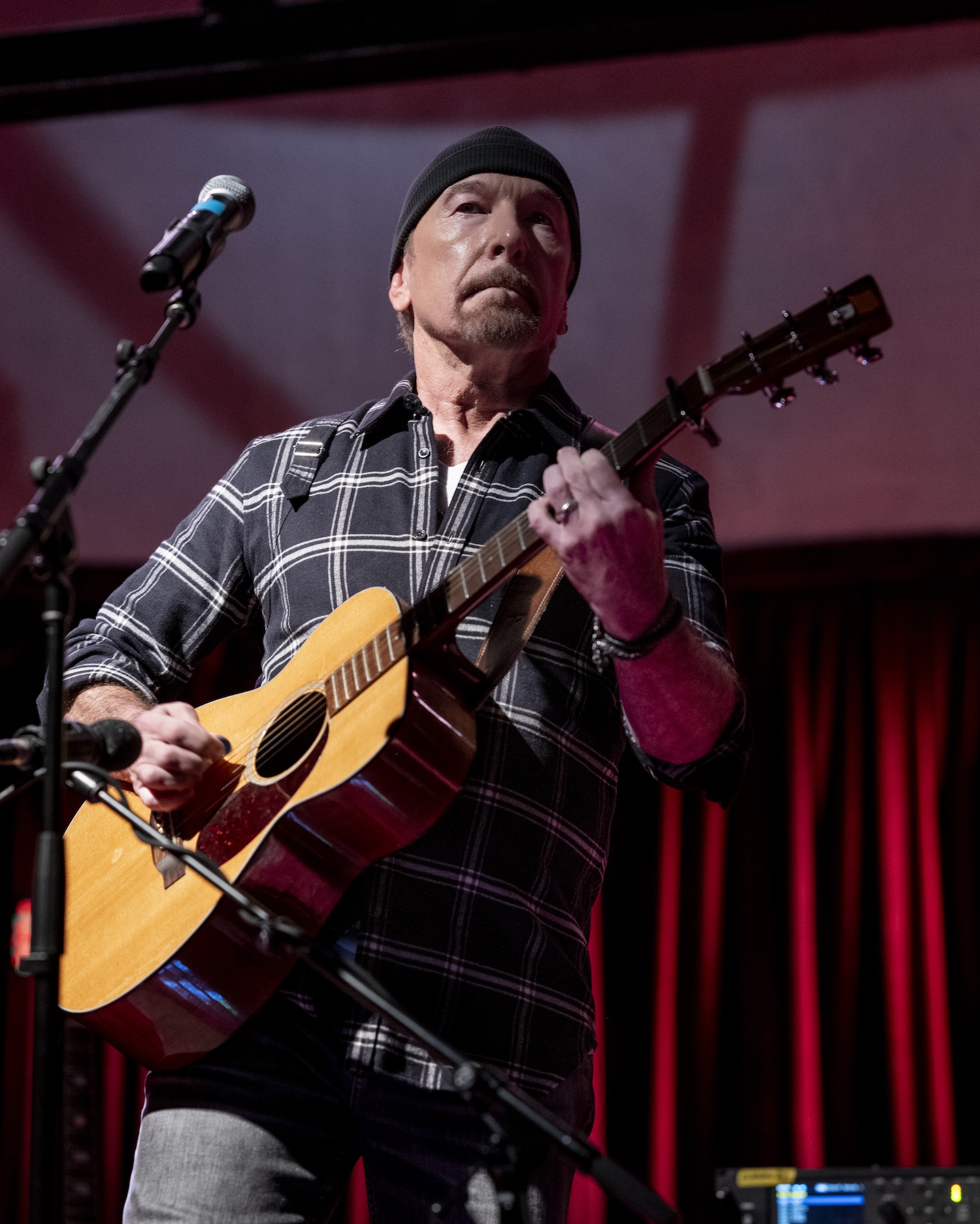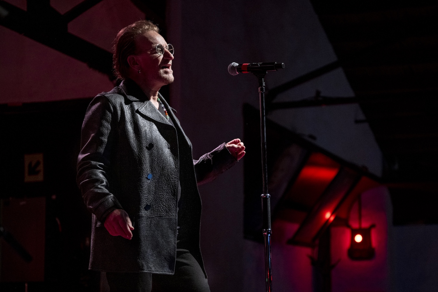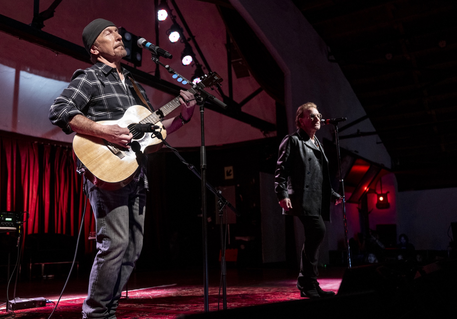 When speaking with T Bone about the songwriting process relative to protest songs, Bono and Edge both spoke about needing to be moved. Bono said, “you can’t write a song to order.” He elaborated with a surprise to the audience by reading lyrics to a song that is a work in progress, written about the killing of Awdah Hathaleen, the Palestinian activist and consultant on the Oscar-winning documentary “No Other Land” murdered in July 2025 by an Israeli settler. It’s been widely reported that U2 is in the studio working on new music and this was the first glimpse of any content. Bono cited lyrics that began:
