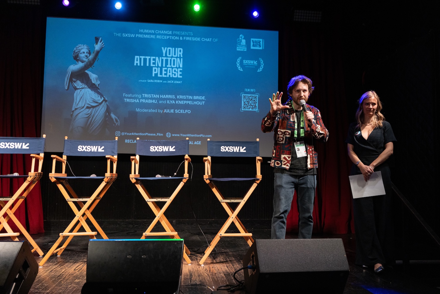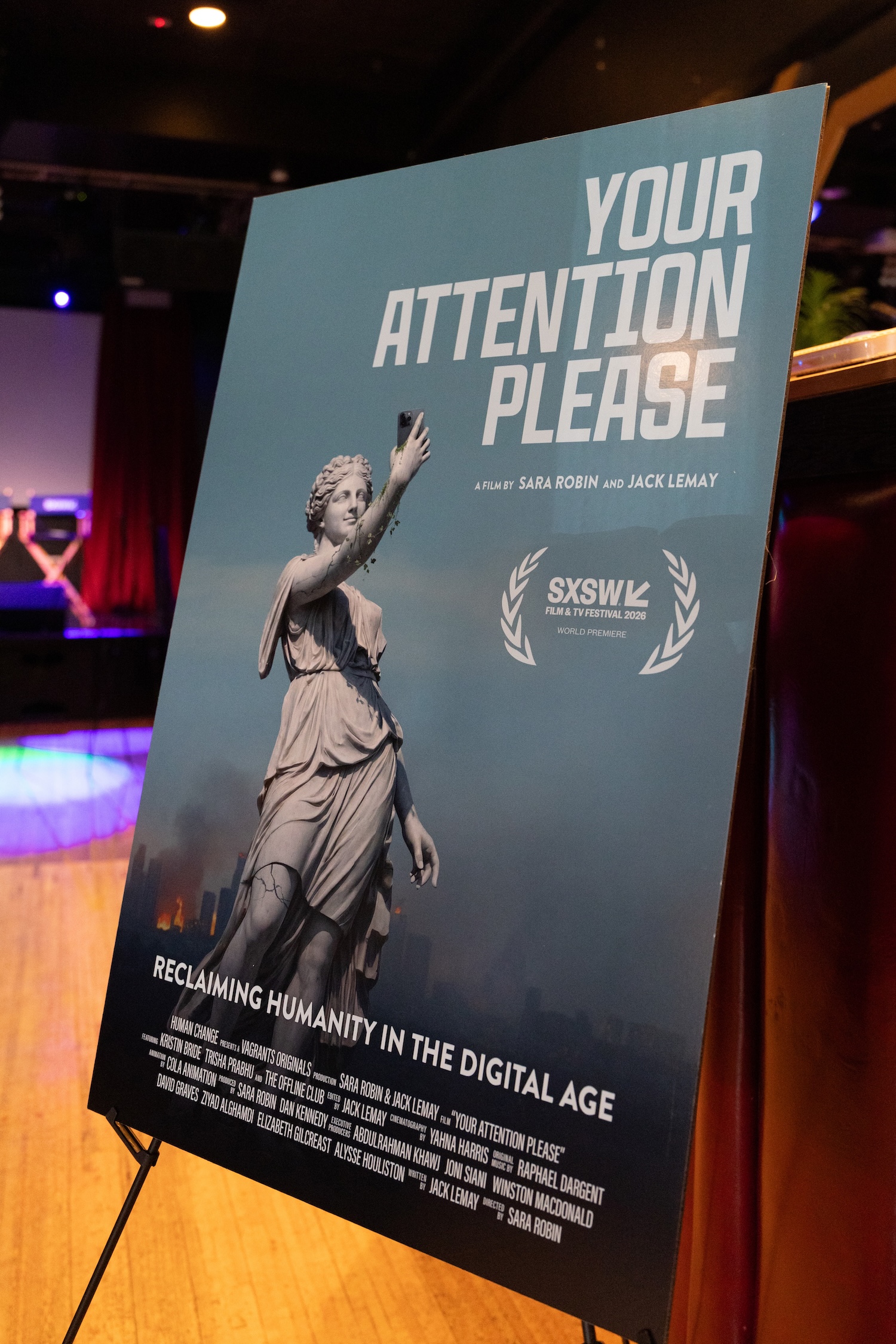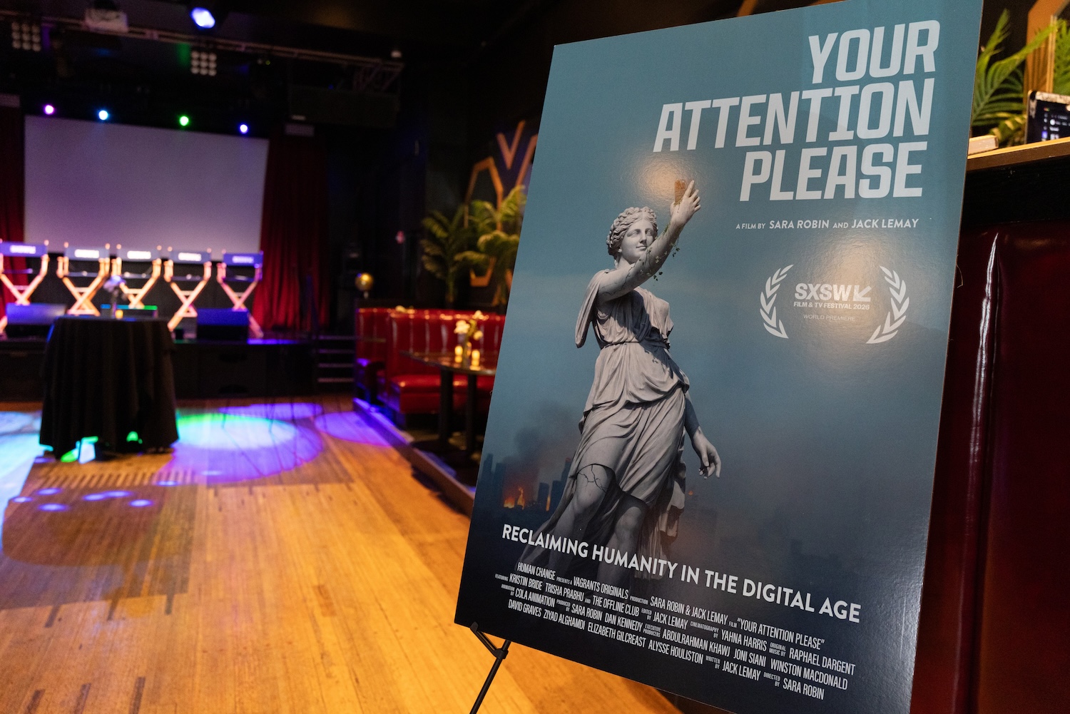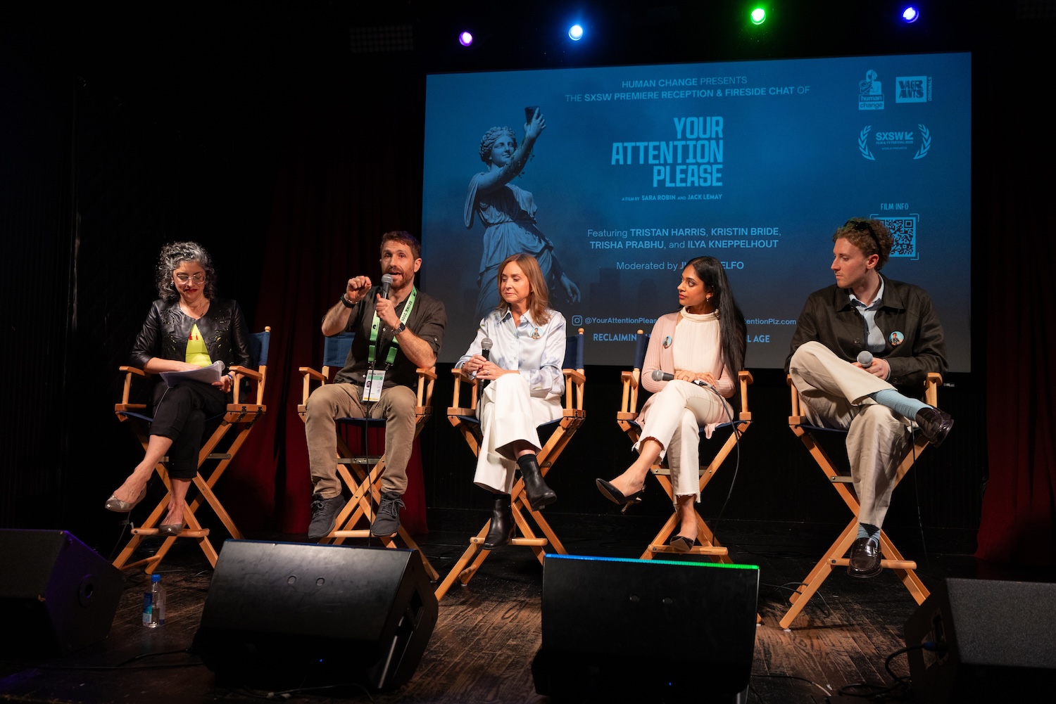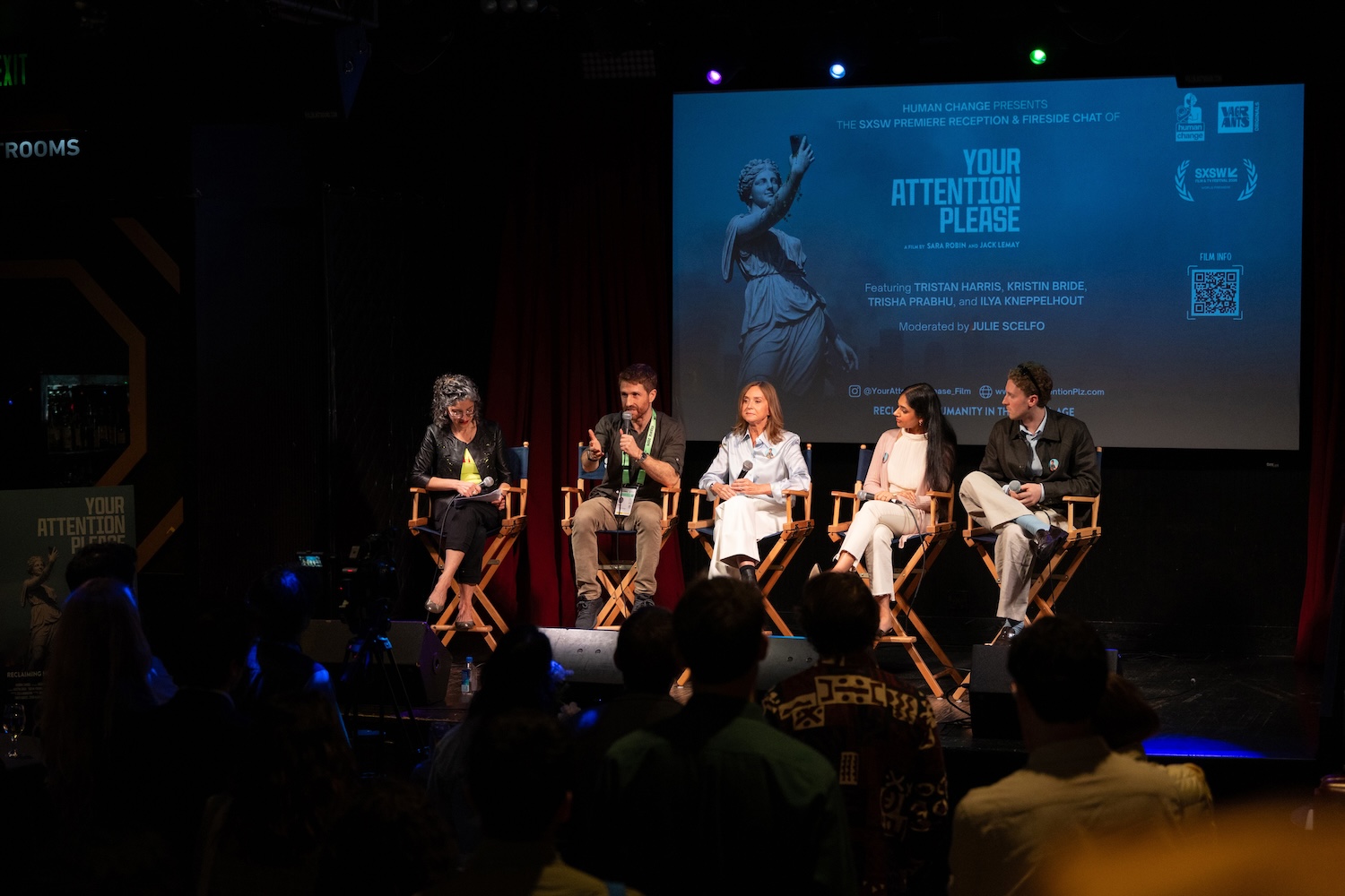 The evening included a world premiere screening, SXSW Q&A, and a reception and fireside chat presented by Human Change, featuring Tristan Harris (Center for Humane Technology), Kristin Bride (advocate and film subject), Trisha Prabhu (founder of ReThink Citizens), and Ilya Kneppelhout (founder of the Offline Club), moderated by Julie Scelfo, founder of Mothers Against Media Addiction. Director Sara Robin and co-creator Jack LeMay were also in attendance.
