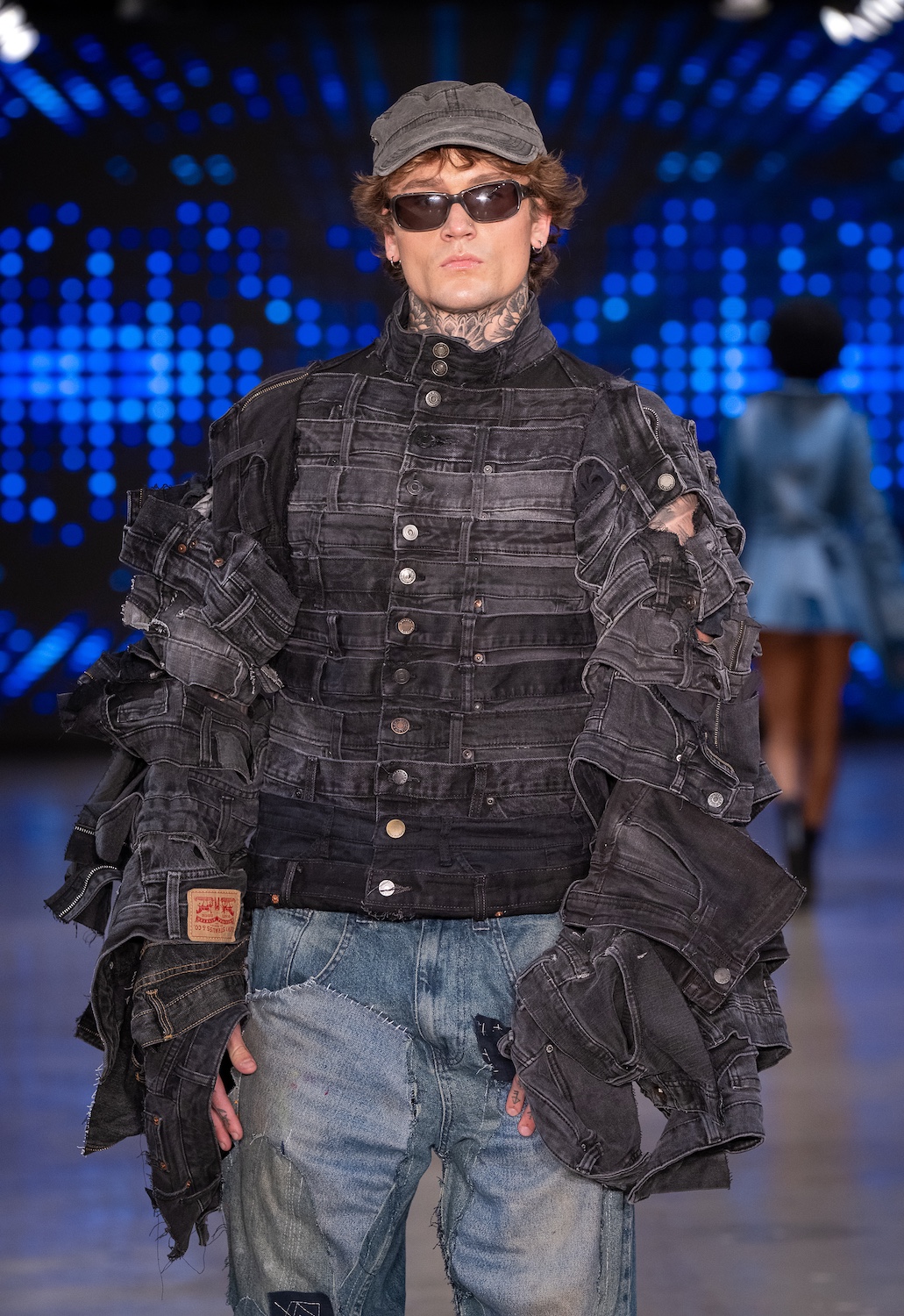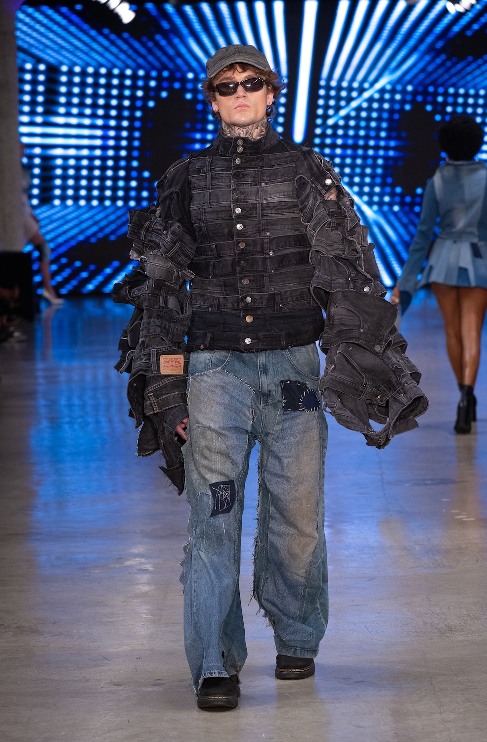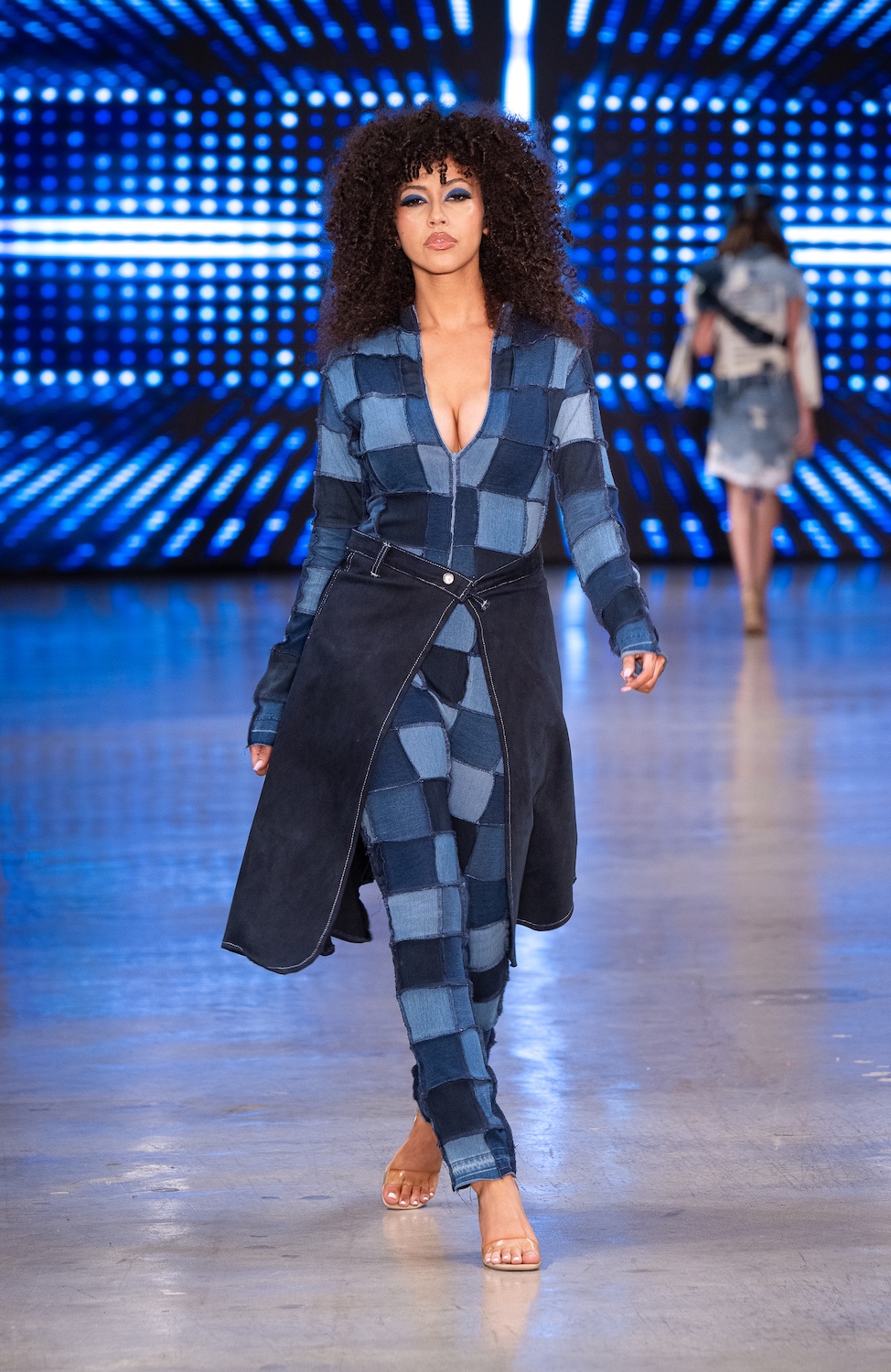 LOS ANGELES, CALIFORNIA - OCTOBER 18: A model walks the runway at the Upcycle Denim & Sustainability Project 2025 show during Los Angeles Fashion Week Powered By Art Hearts Fashion at The New Mart on October 18, 2025 in Los Angeles, California. (Photo by Mark Gunter/Getty Images for Art Hearts Fashion)
