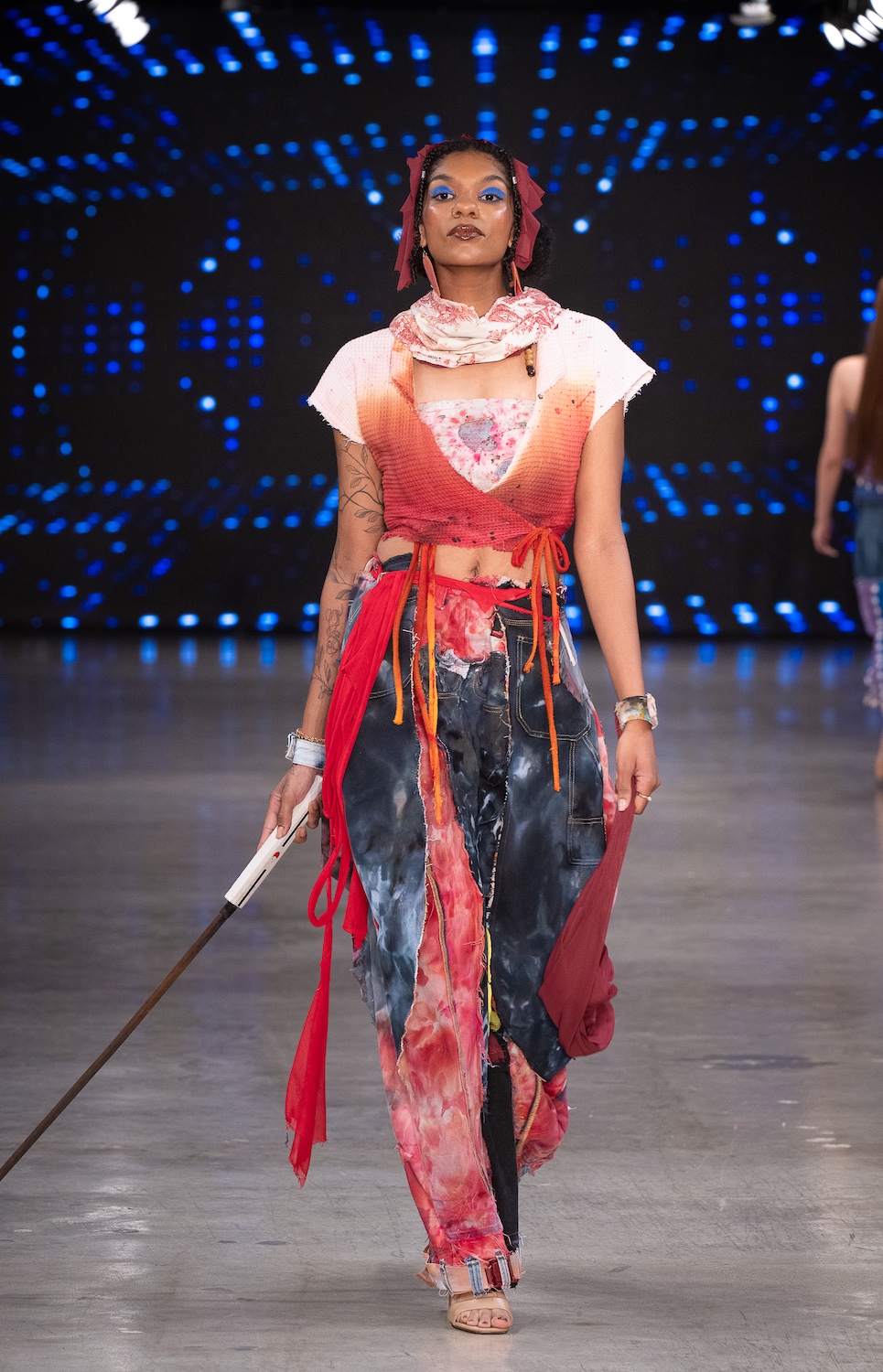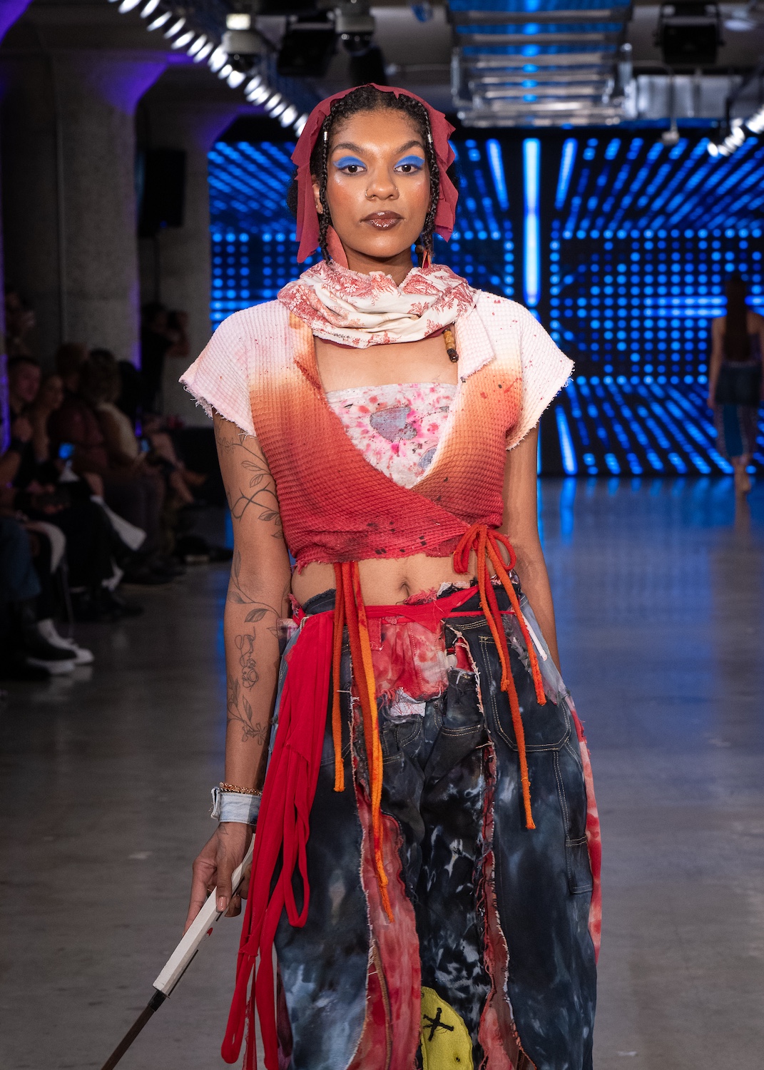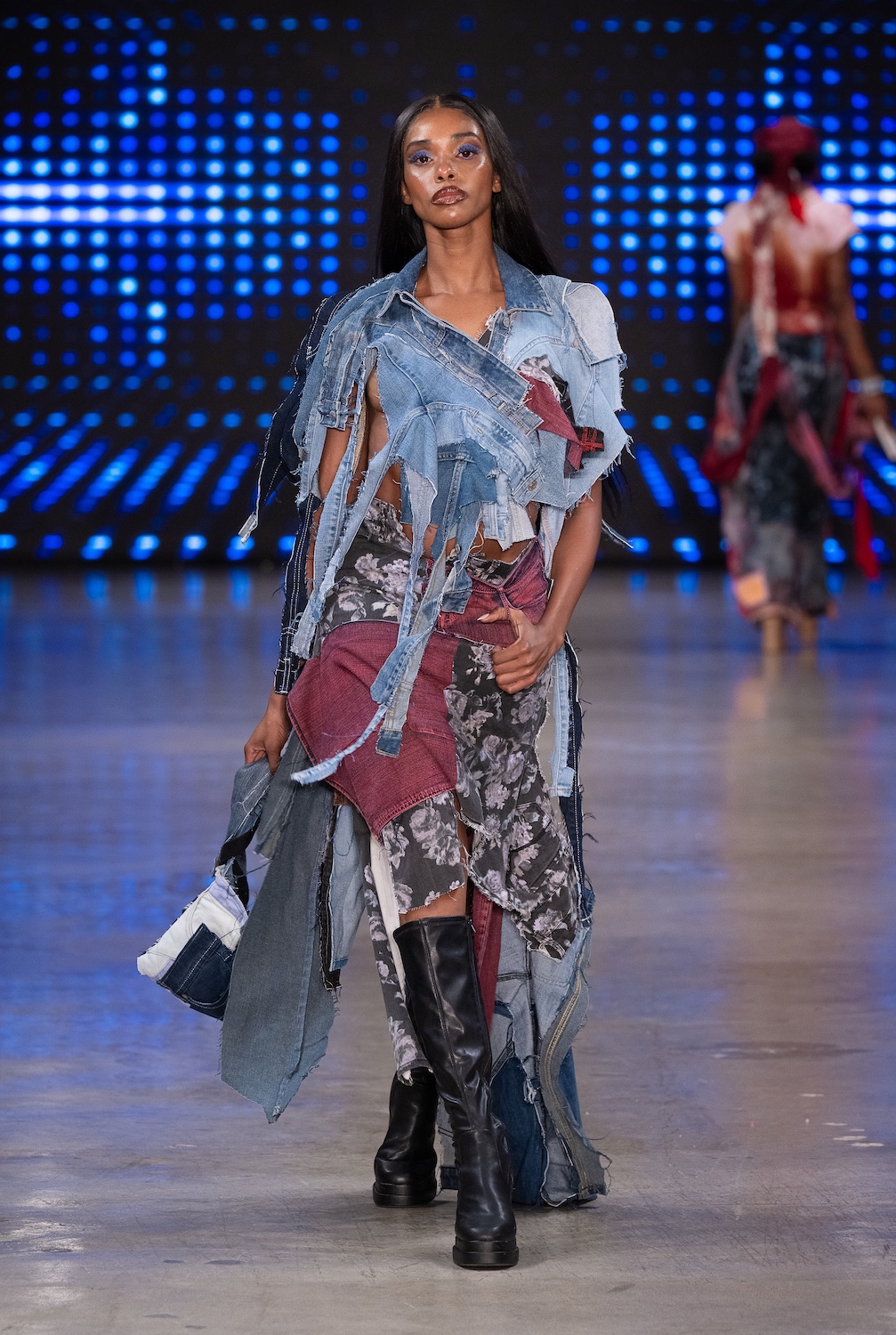 LOS ANGELES, CALIFORNIA - OCTOBER 18: A model walks the runway at the Upcycle Denim & Sustainability Project 2025 show during Los Angeles Fashion Week Powered By Art Hearts Fashion at The New Mart on October 18, 2025 in Los Angeles, California. (Photo by Mark Gunter/Getty Images for Art Hearts Fashion)