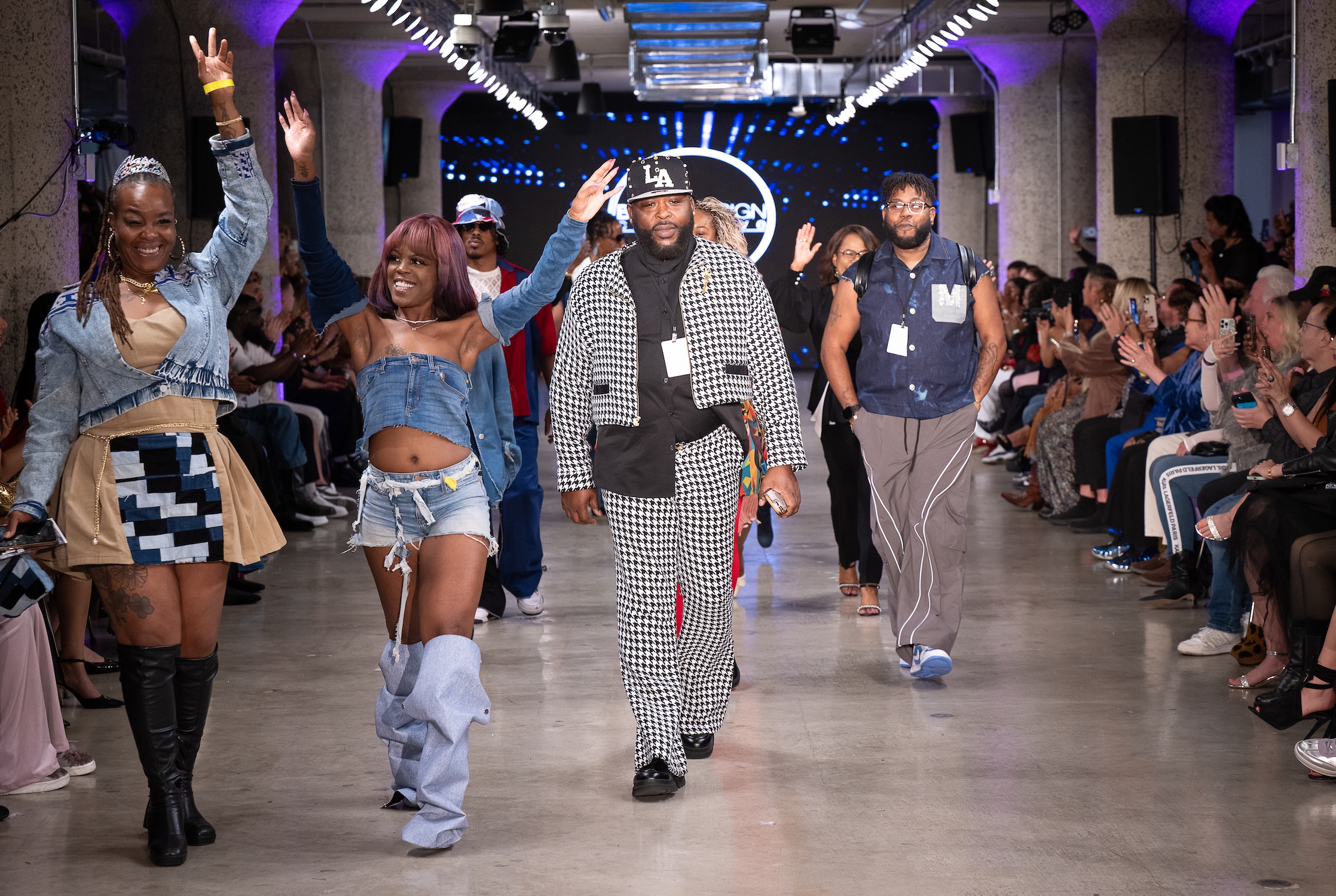 LOS ANGELES, CALIFORNIA - OCTOBER 18: Designer and models walk the runway at the Upcycle Denim & Sustainability Project 2025 show during Los Angeles Fashion Week Powered By Art Hearts Fashion at The New Mart on October 18, 2025 in Los Angeles, California. (Photo by Mark Gunter/Getty Images for Art Hearts Fashion)