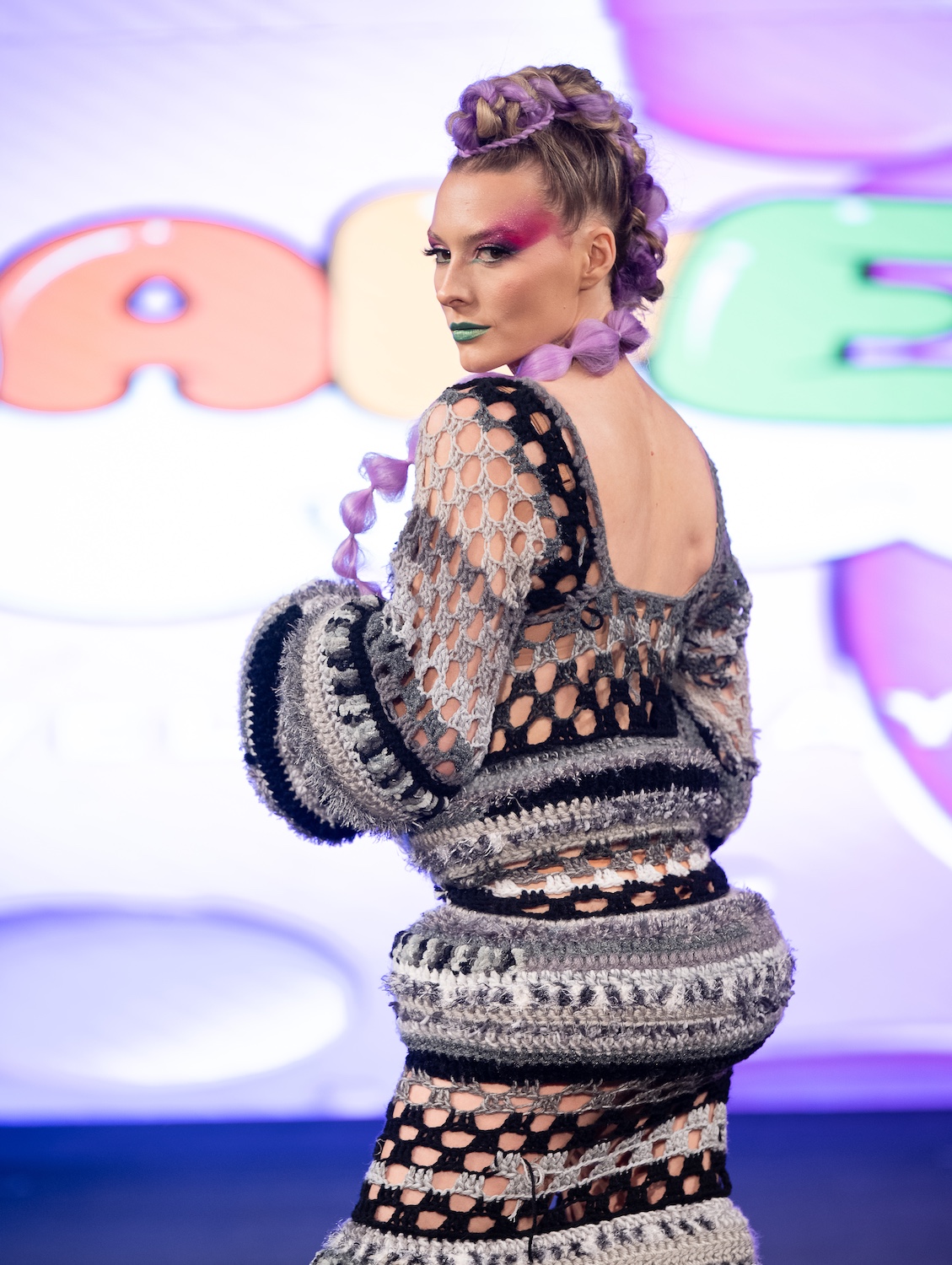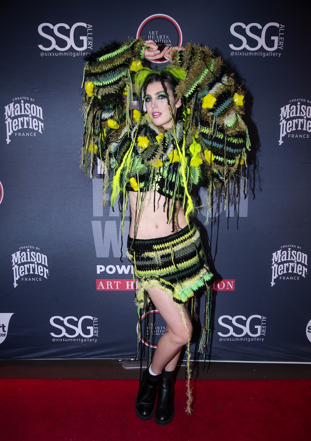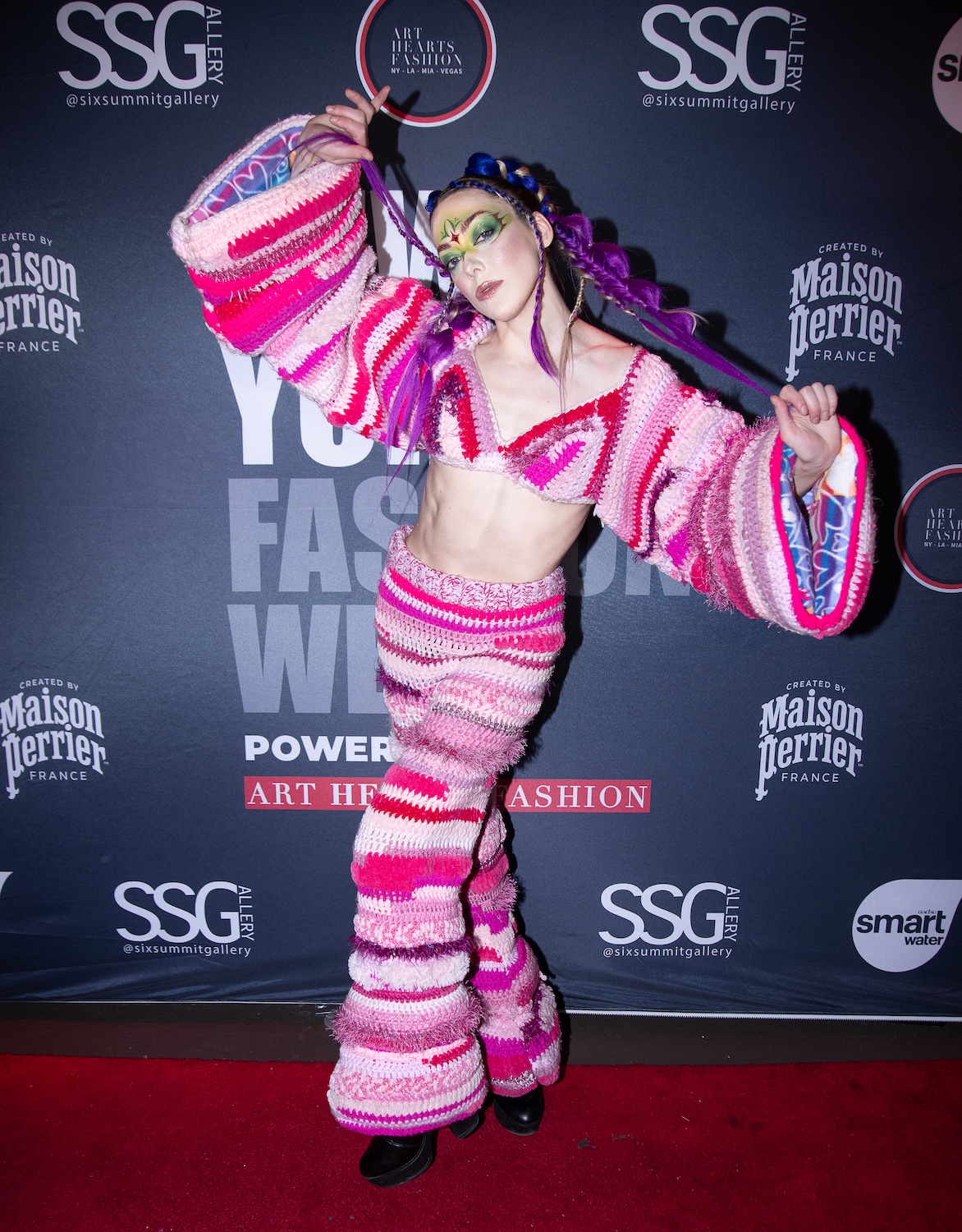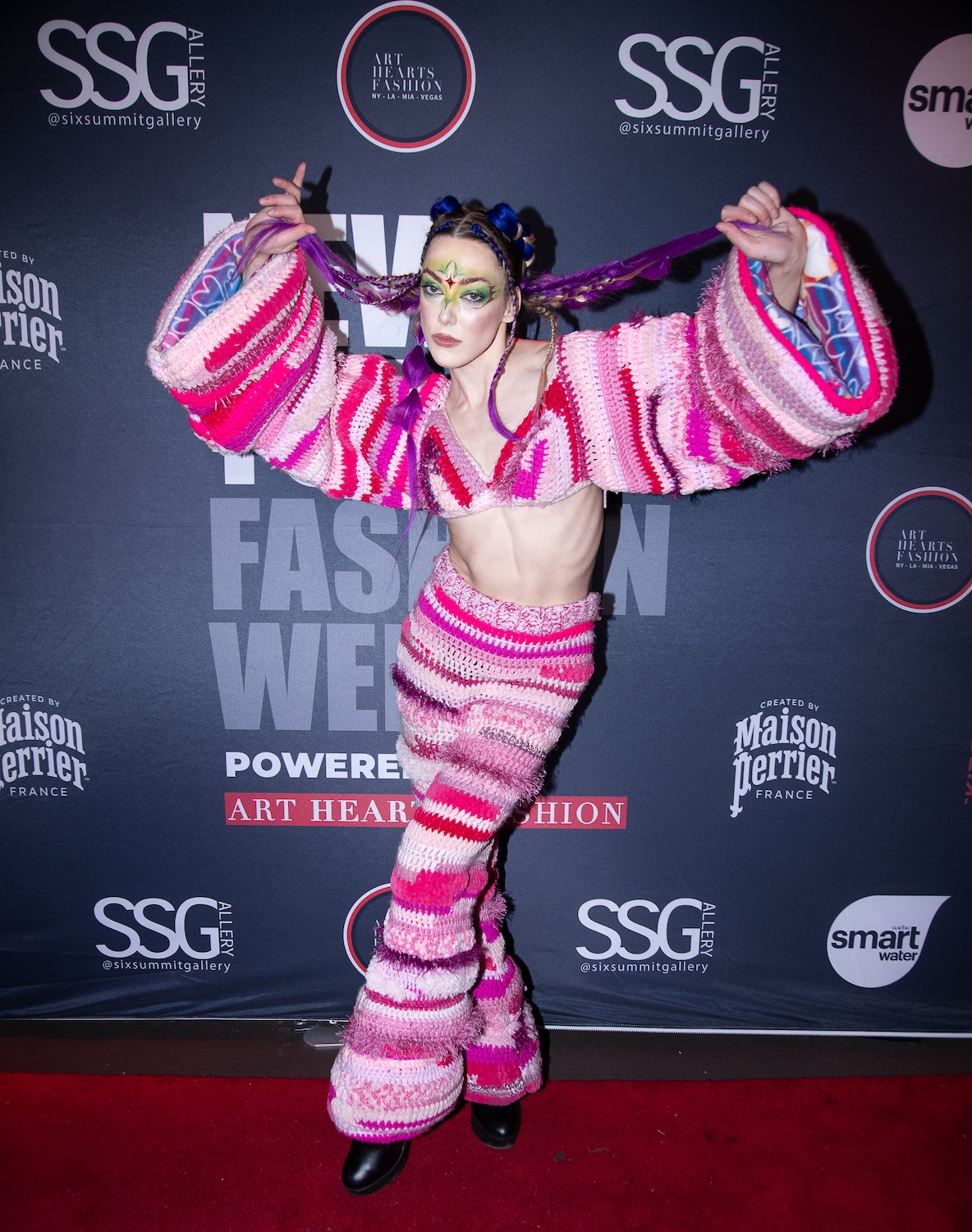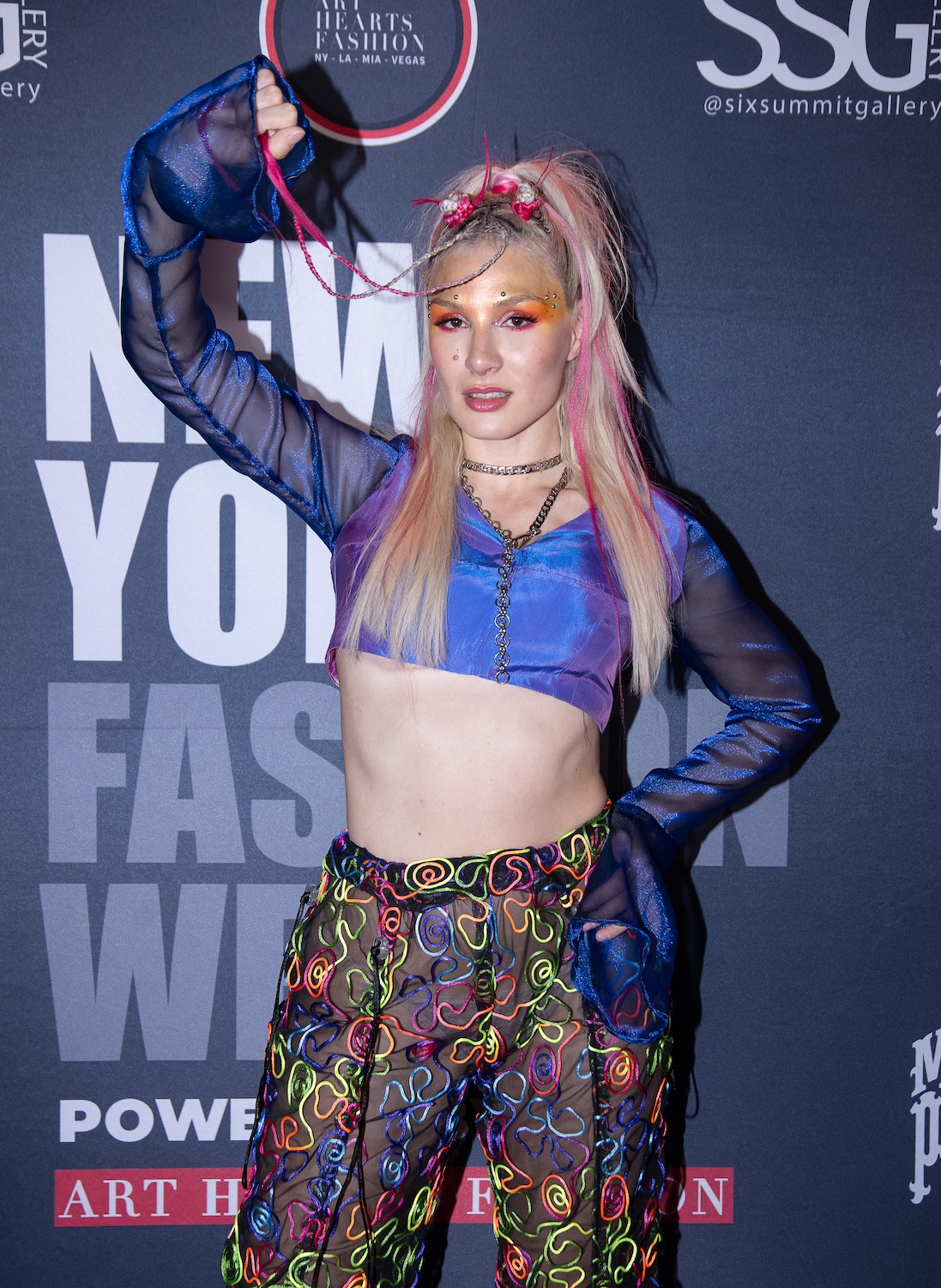 NEW YORK, NEW YORK - FEBRUARY 09: A model arrives on the red carpet wearing Chavelis Playhouse during New York Fashion Week Powered By Art Hearts Fashion at The Angel Orensanz Foundation on February 09, 2025 in New York City. (Photo by Mark Gunter/Getty Images for Art Hearts Fashion)