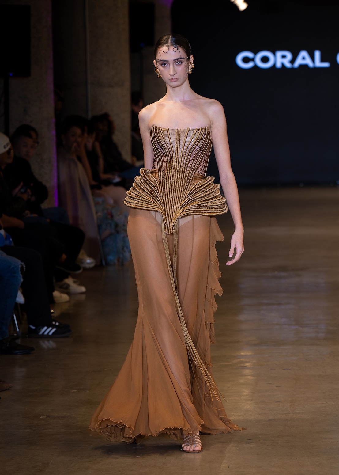 LOS ANGELES, CALIFORNIA - OCTOBER 16: Designer Coral Castillo walks the runway at the Coral Castillo show during Los Angeles Fashion Week Powered By Art Hearts Fashion at The New Mart on October 16, 2025 in Los Angeles, California. (Photo by Mark Gunter/Getty Images for Art Hearts Fashion)