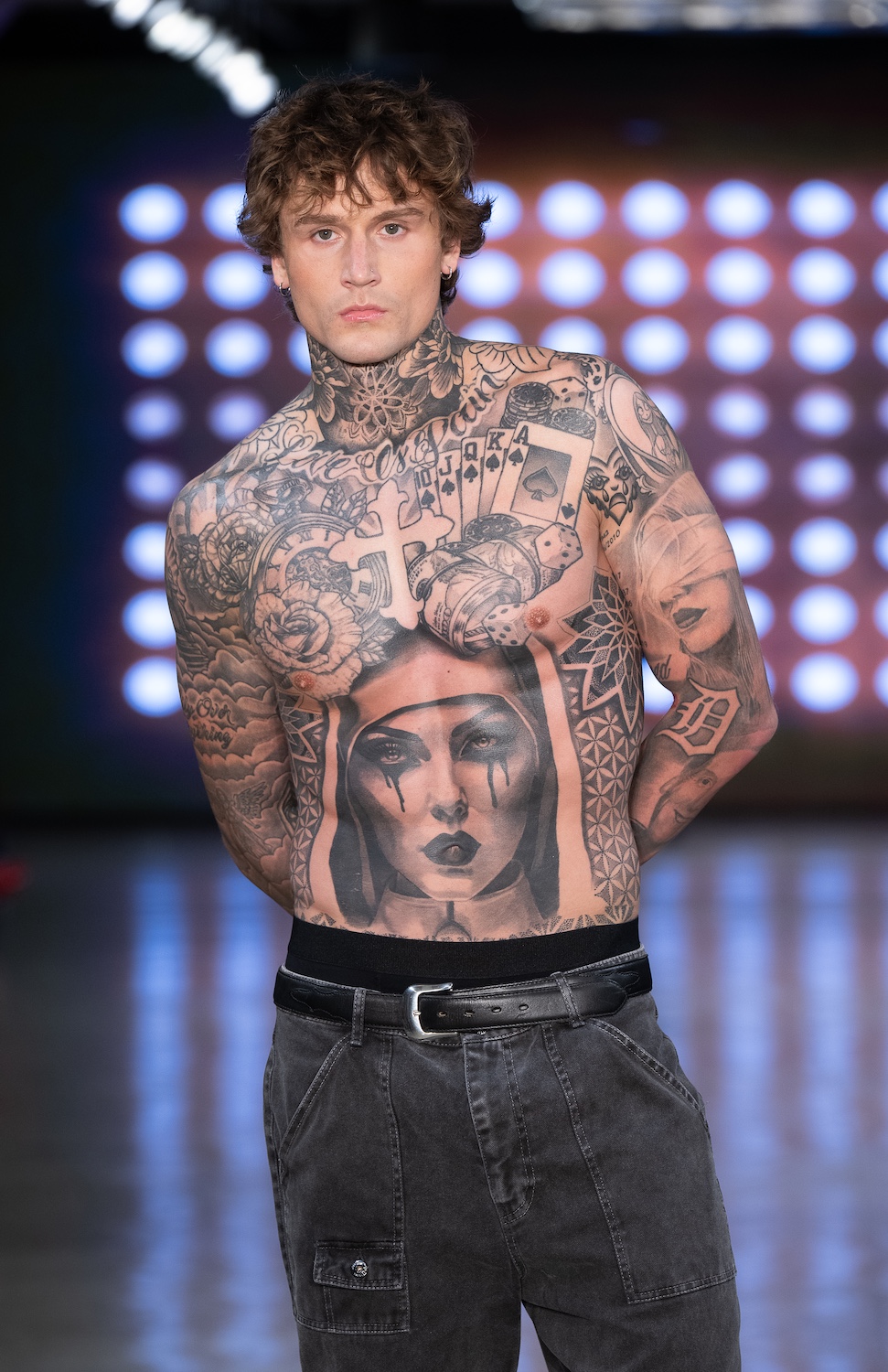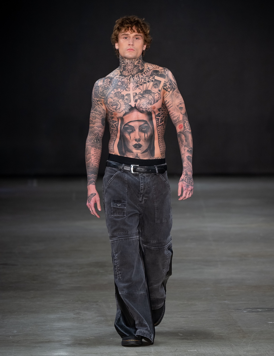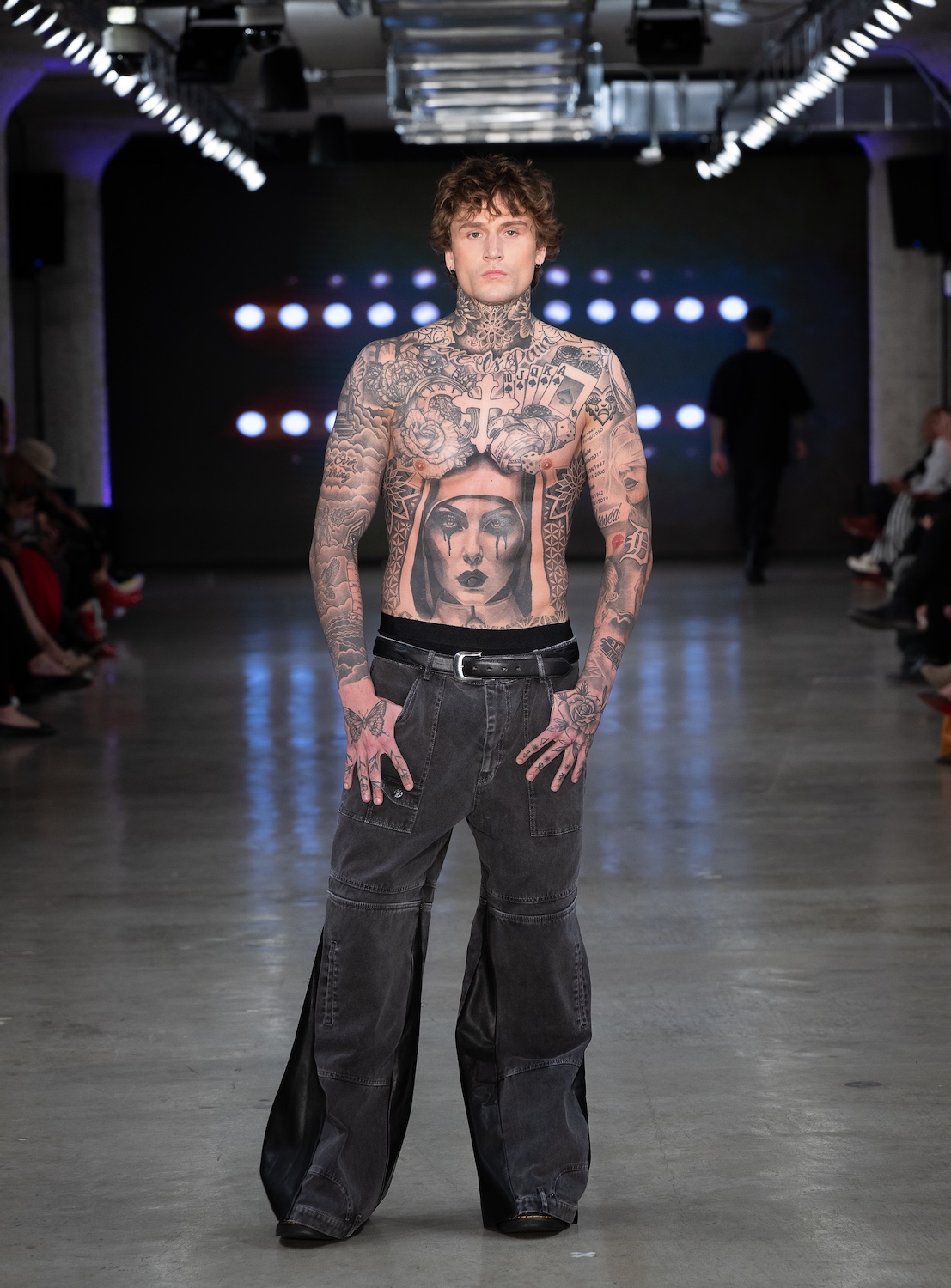 LOS ANGELES, CALIFORNIA - OCTOBER 17: Model Kadeem Pilgram walks the runway at the Cross Colours show during Los Angeles Fashion Week Powered By Art Hearts Fashion at The New Mart on October 17, 2025 in Los Angeles, California. (Photo by Mark Gunter/Getty Images for Art Hearts Fashion)