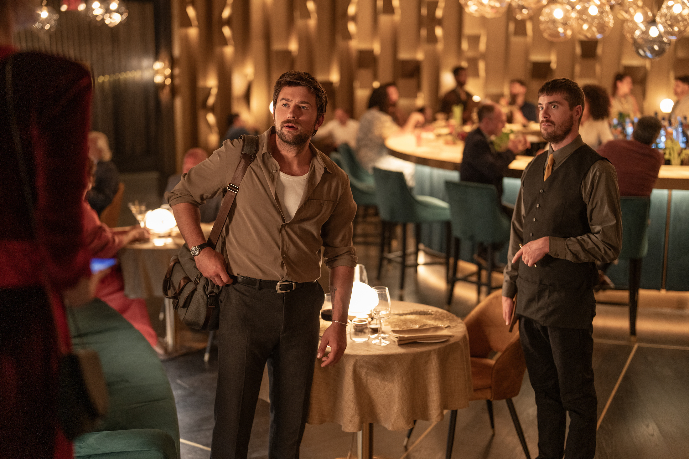 (from left) Henry (Brandon Sklenar) and Matt (Jeffrey Self) in Drop, directed by Christopher Landon.