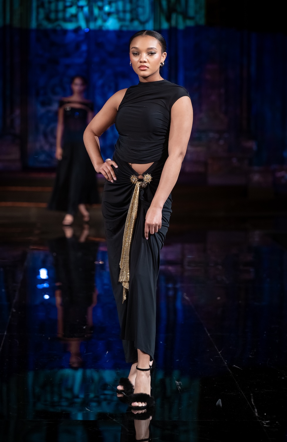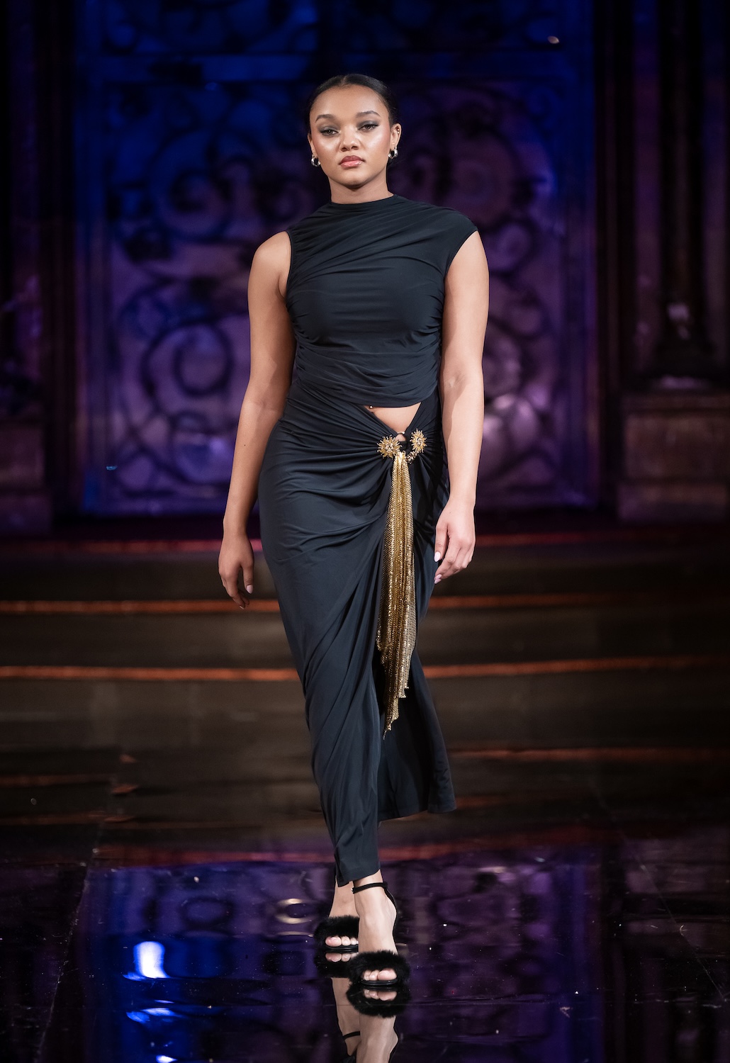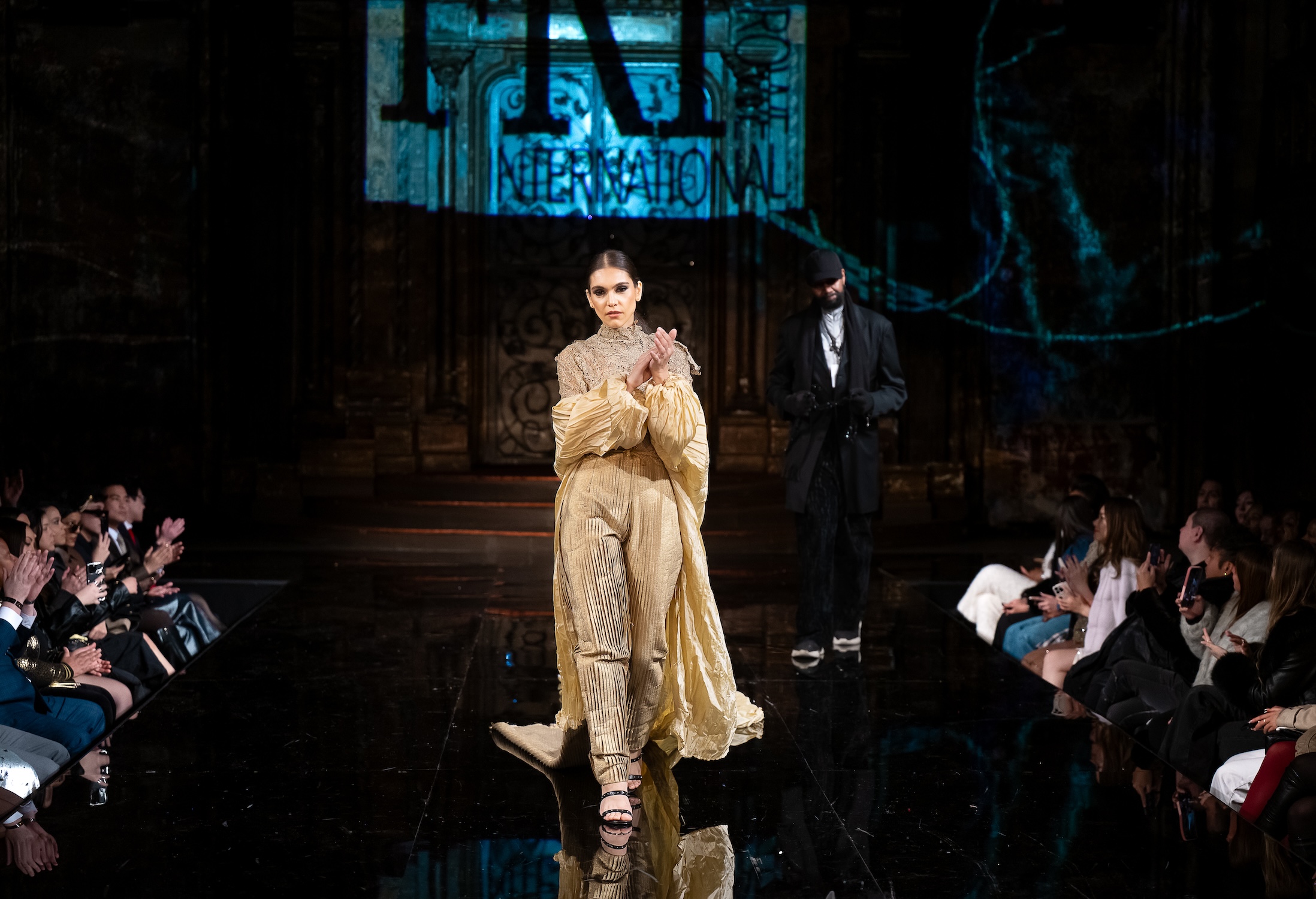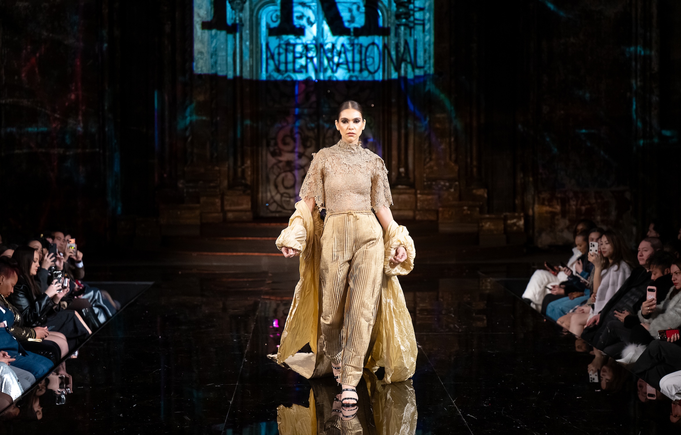 NEW YORK, NEW YORK - FEBRUARY 08: A model walks the runway at the NIF Global x London School of Trends show during New York Fashion Week Powered By Art Hearts Fashion at The Angel Orensanz Foundation on February 08, 2025 in New York City. (Photo by Arun Nevader/Getty Images for Art Hearts Fashion)