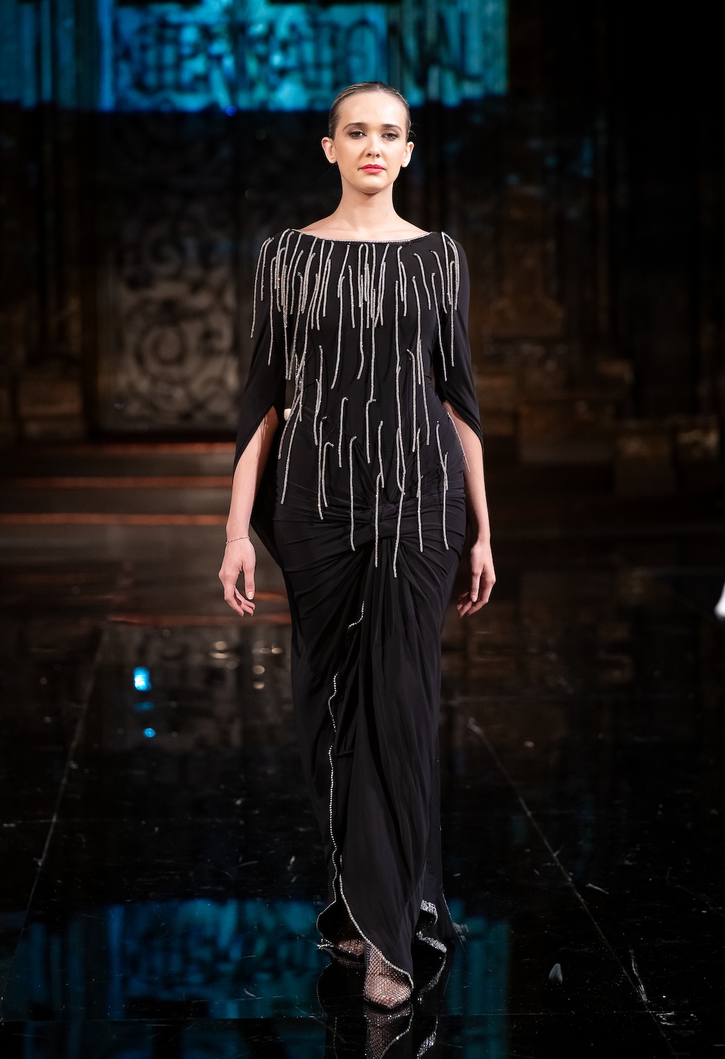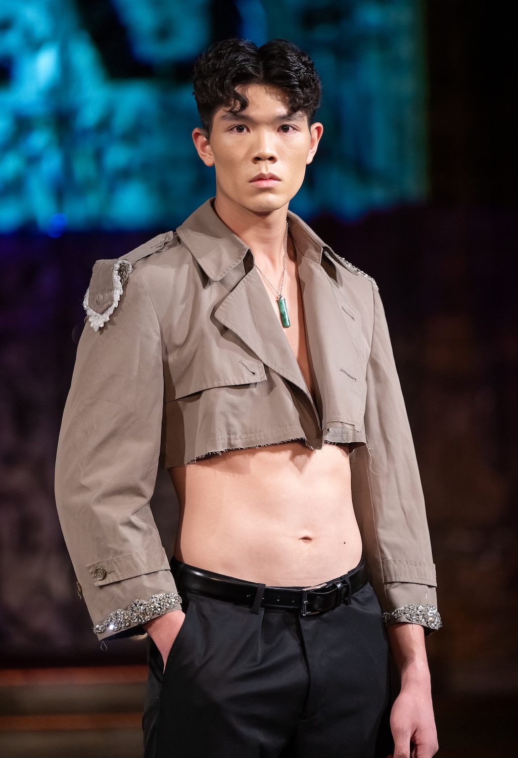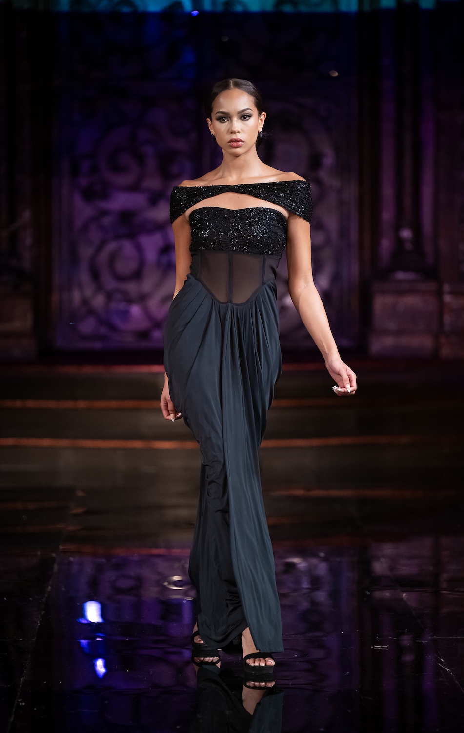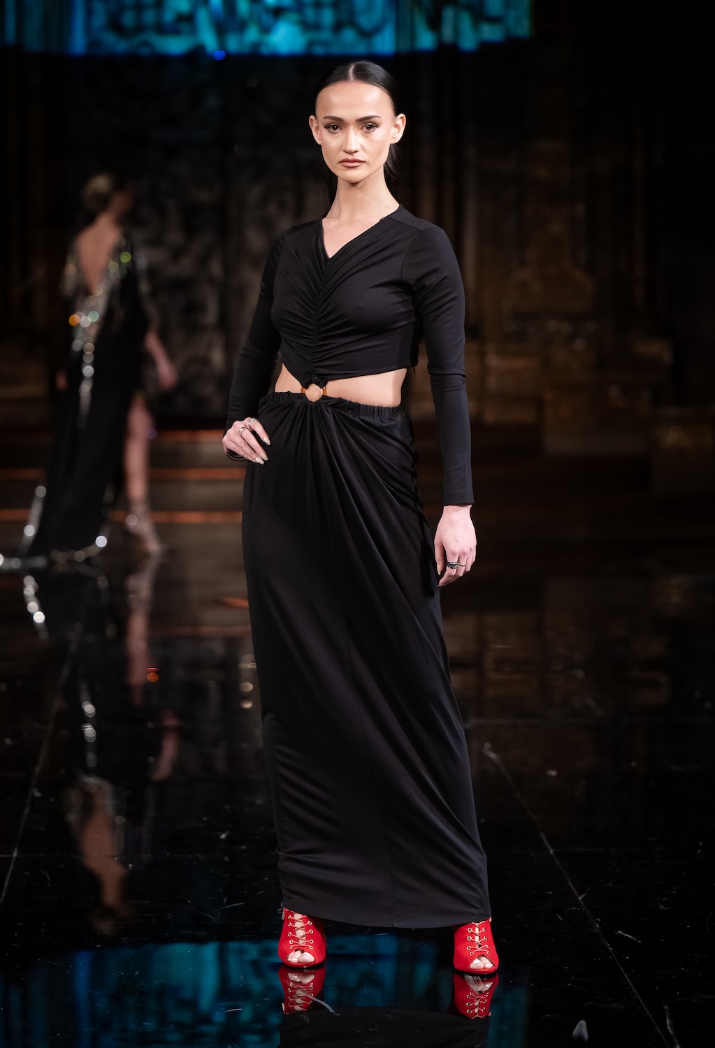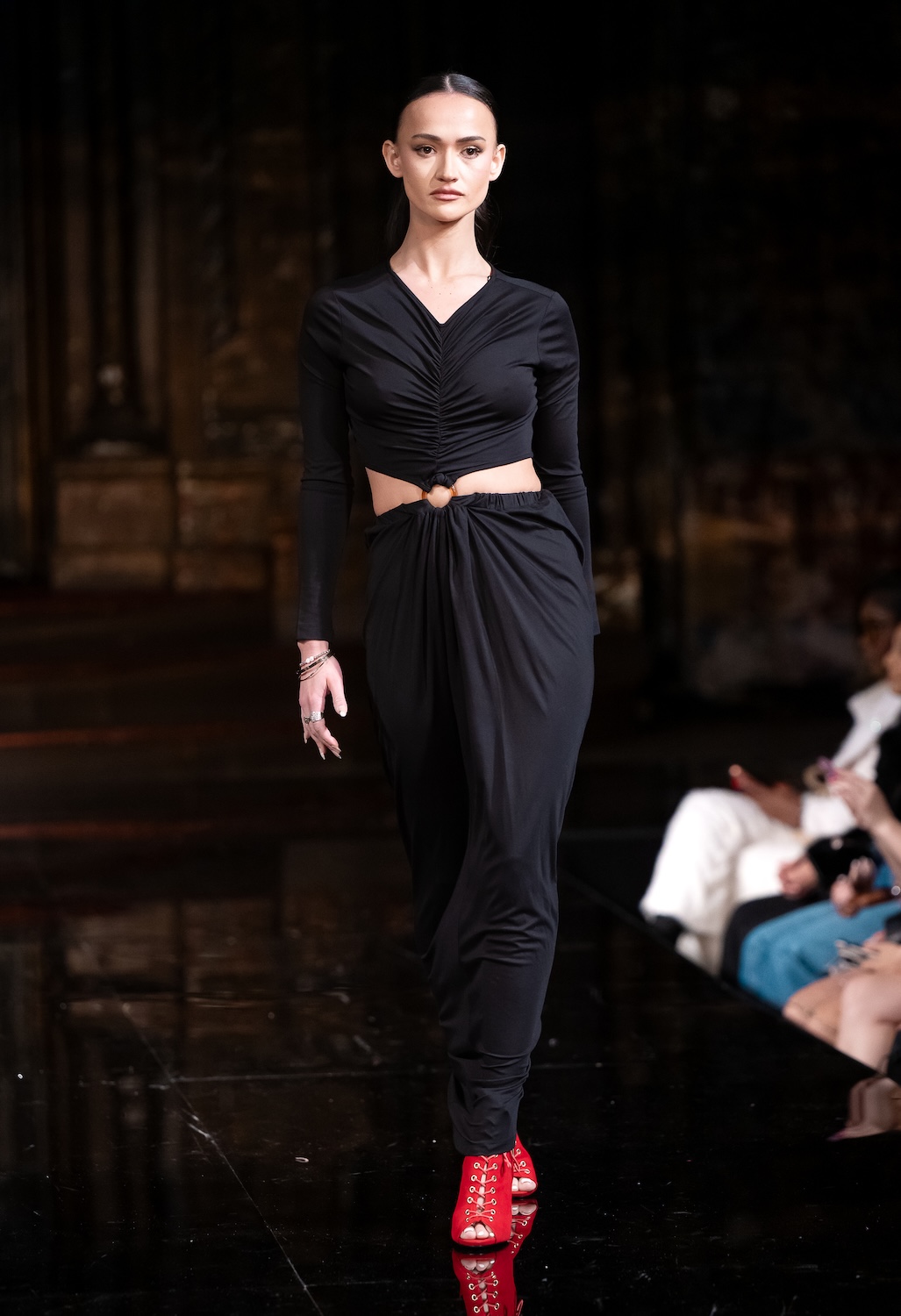 NEW YORK, NEW YORK - FEBRUARY 08: A model walks the runway at the NIF Global x London School of Trends show during New York Fashion Week Powered By Art Hearts Fashion at The Angel Orensanz Foundation on February 08, 2025 in New York City. (Photo by Arun Nevader/Getty Images for Art Hearts Fashion)
