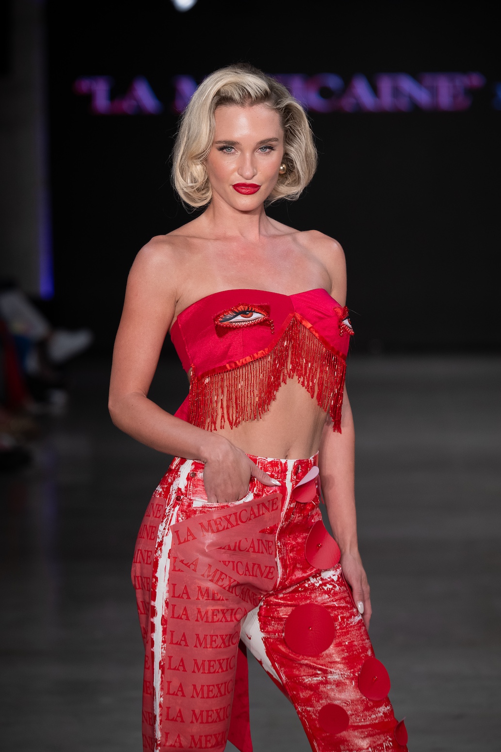 LOS ANGELES, CALIFORNIA - OCTOBER 17: A model walks the runway at the Amara show during Los Angeles Fashion Week Powered By Art Hearts Fashion at The New Mart on October 17, 2025 in Los Angeles, California. (Photo by Mark Gunter/Getty Images for Art Hearts Fashion)