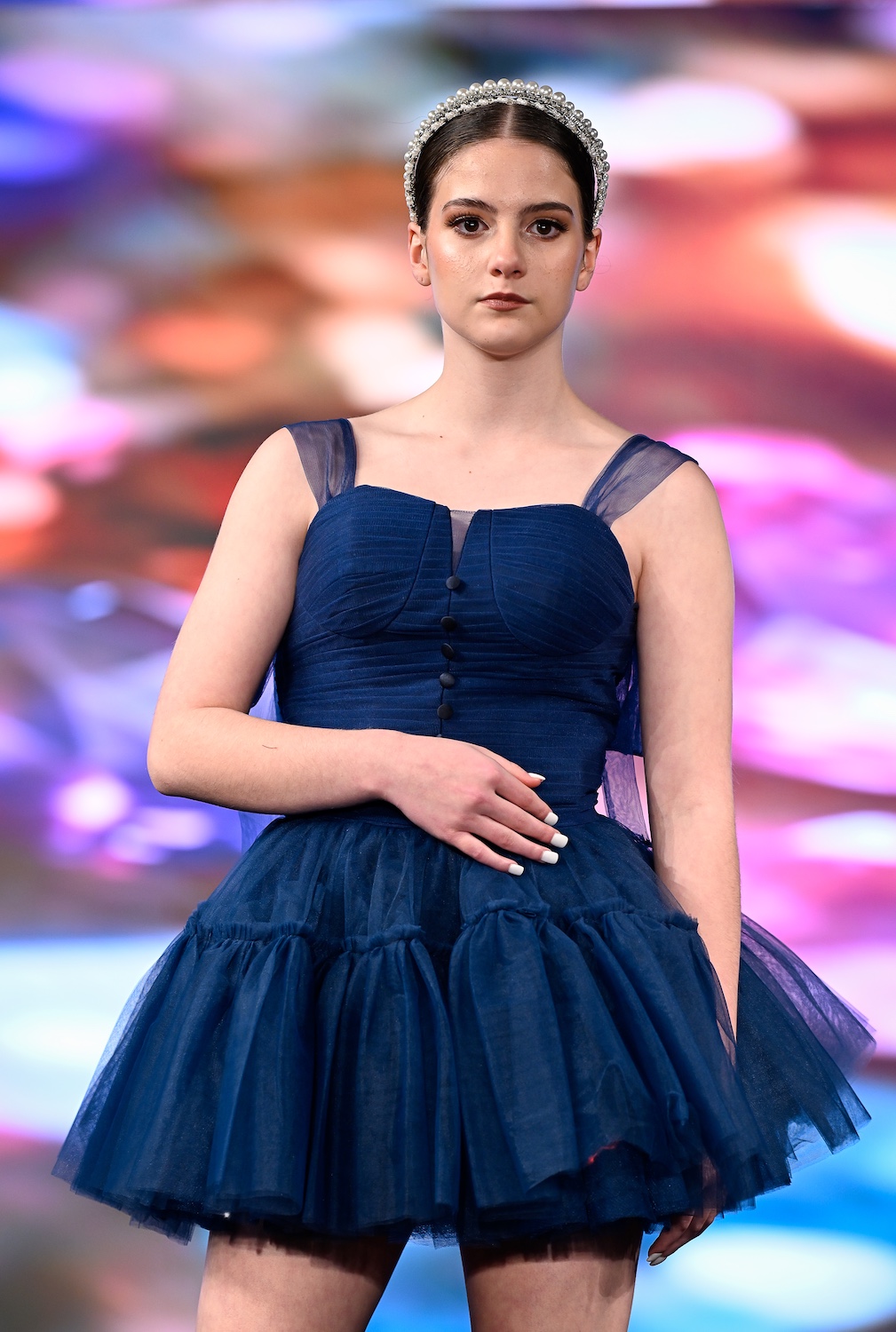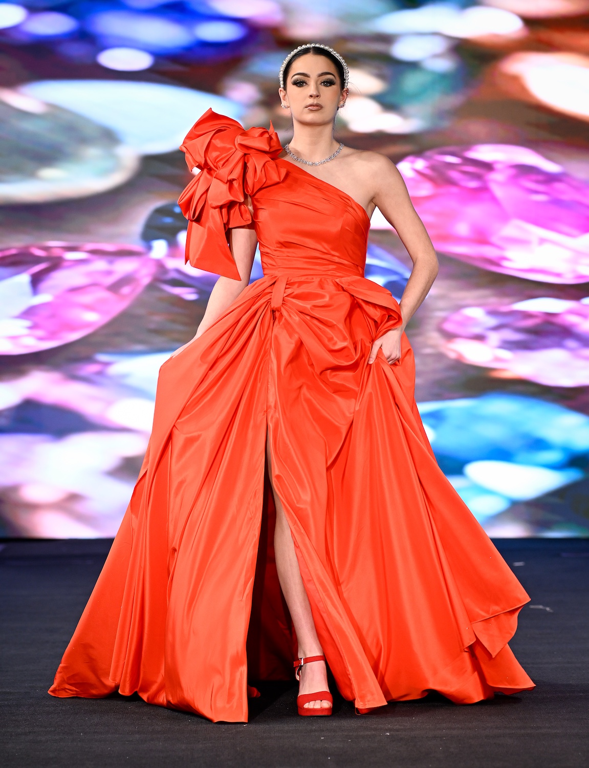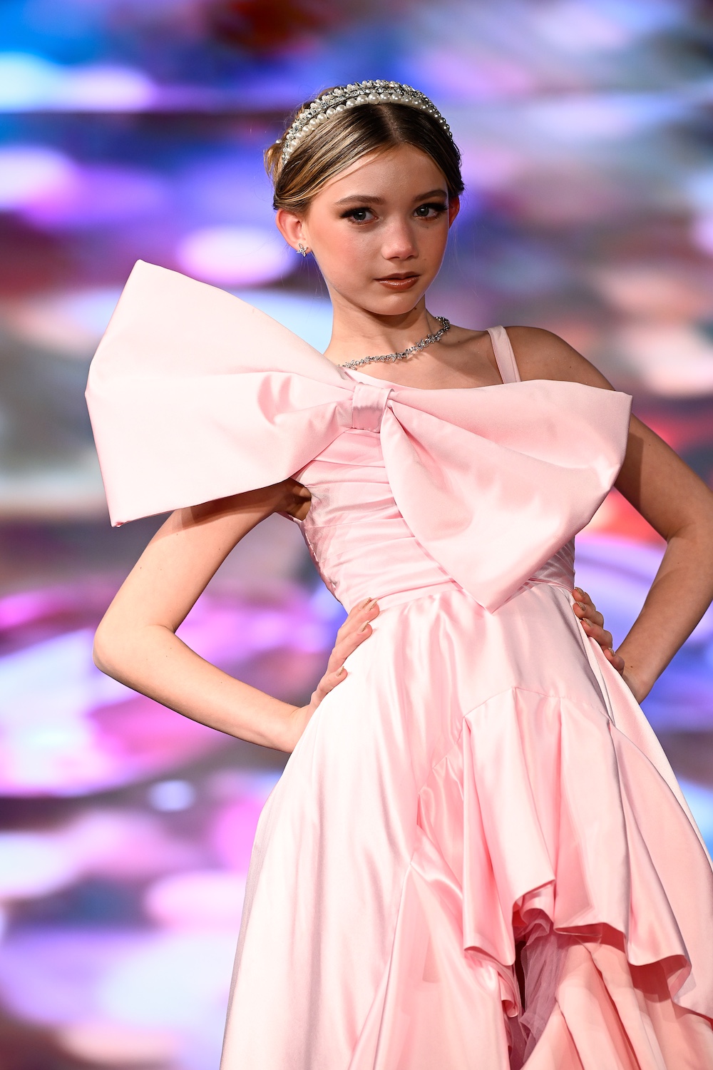 NEW YORK, NEW YORK - FEBRUARY 08: A model walks the runway at the Mila Hoffman show during New York Fashion Week Powered By Art Hearts Fashion at The Angel Orensanz Foundation on February 08, 2025 in New York City. (Photo by Arun Nevader/Getty Images for Art Hearts Fashion)