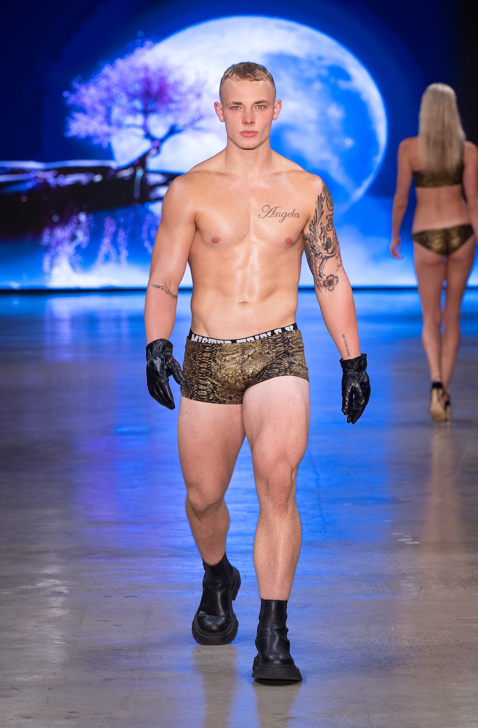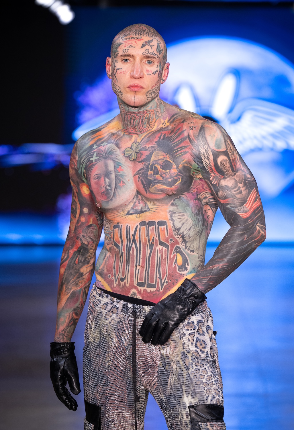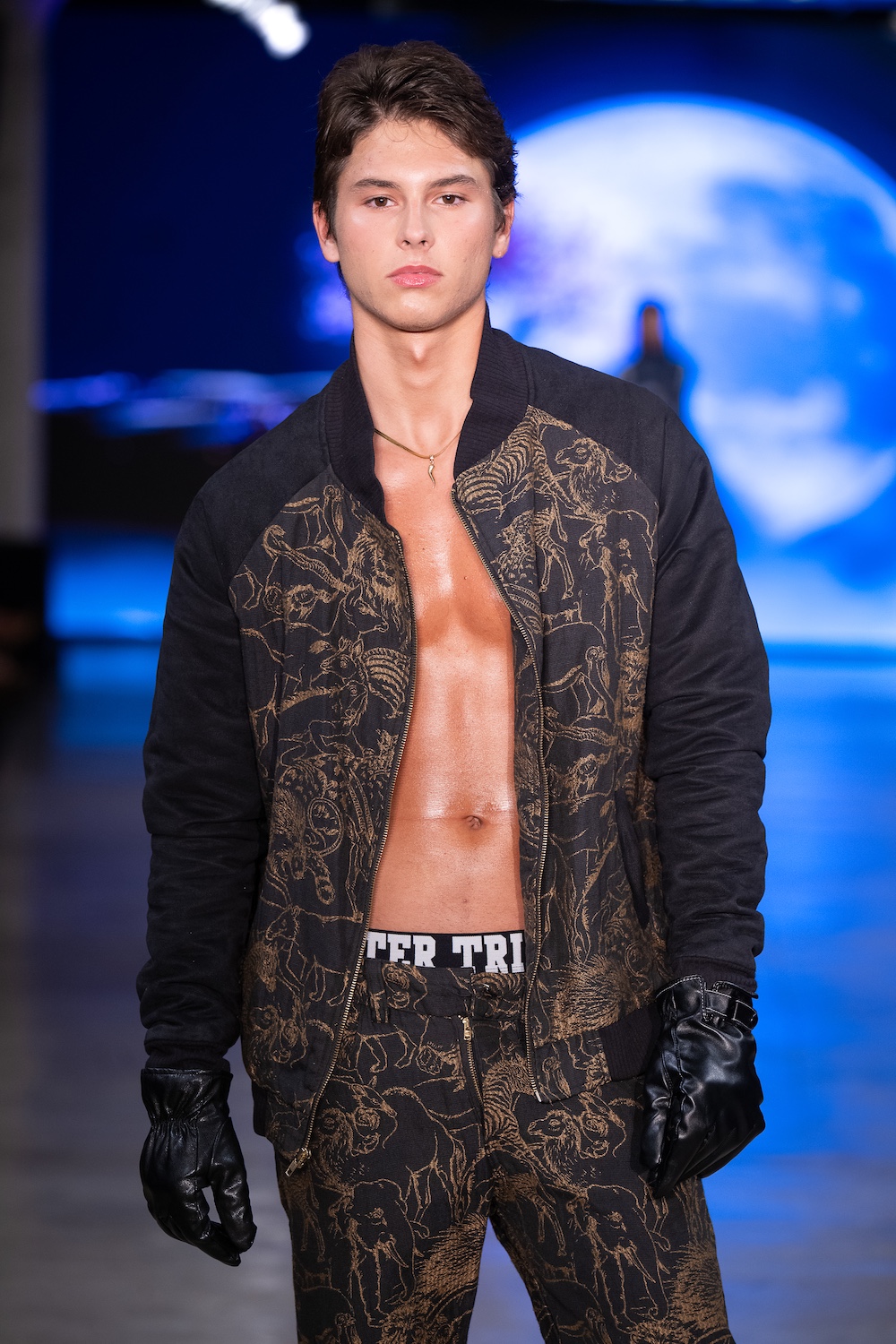 LOS ANGELES, CALIFORNIA - OCTOBER 18: Model Damian Zdunczyk walks the runway at the Mister Triple X show during Los Angeles Fashion Week Powered By Art Hearts Fashion at The New Mart on October 18, 2025 in Los Angeles, California. (Photo by Mark Gunter/Getty Images for Art Hearts Fashion)