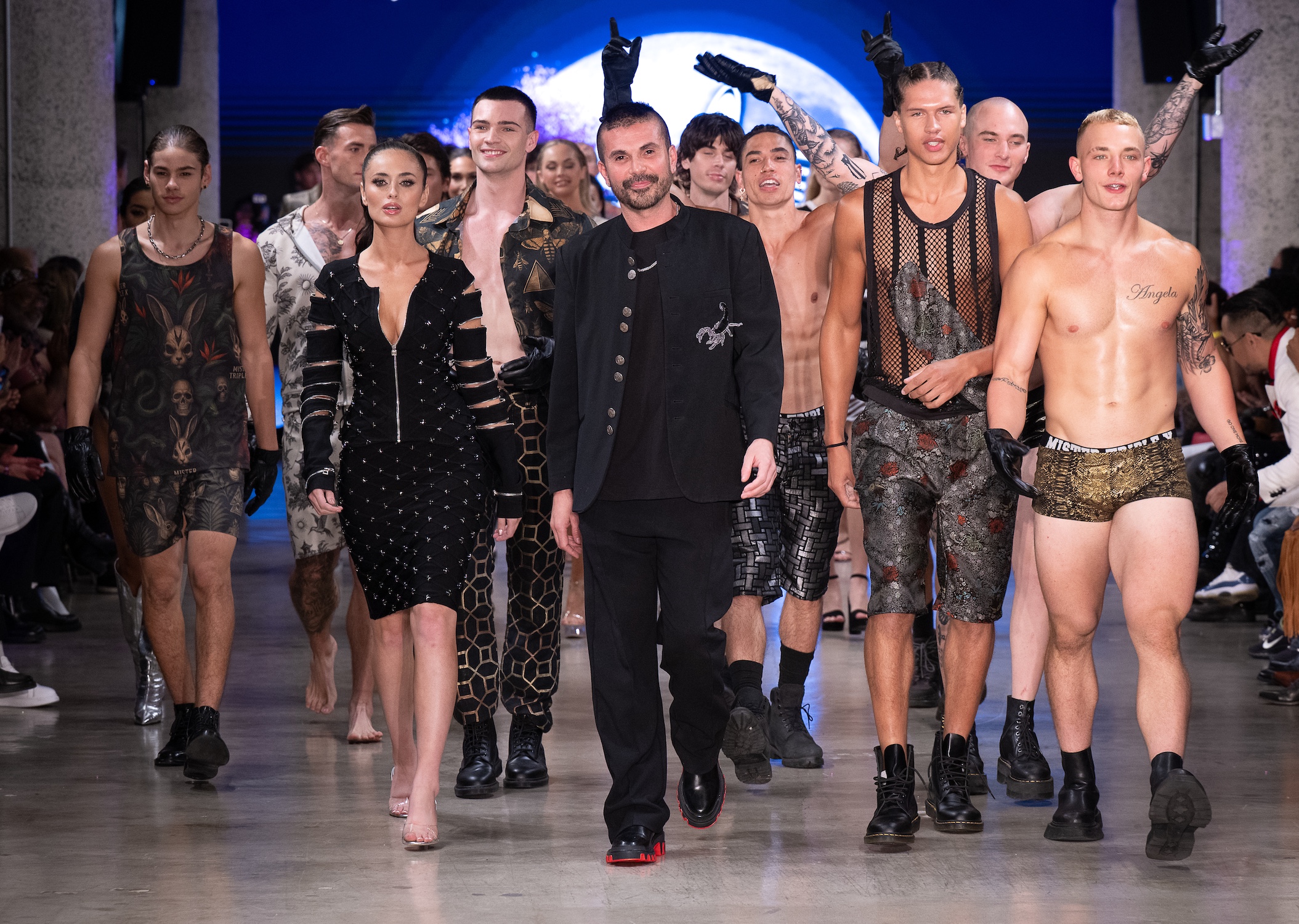 LOS ANGELES, CALIFORNIA - OCTOBER 18: Designer Erik Rosete and models walk the runway at the Mister Triple X show during Los Angeles Fashion Week Powered By Art Hearts Fashion at The New Mart on October 18, 2025 in Los Angeles, California. (Photo by Mark Gunter/Getty Images for Art Hearts Fashion)