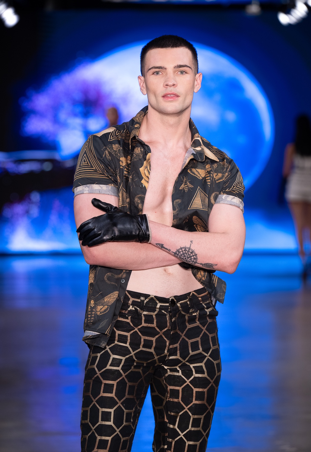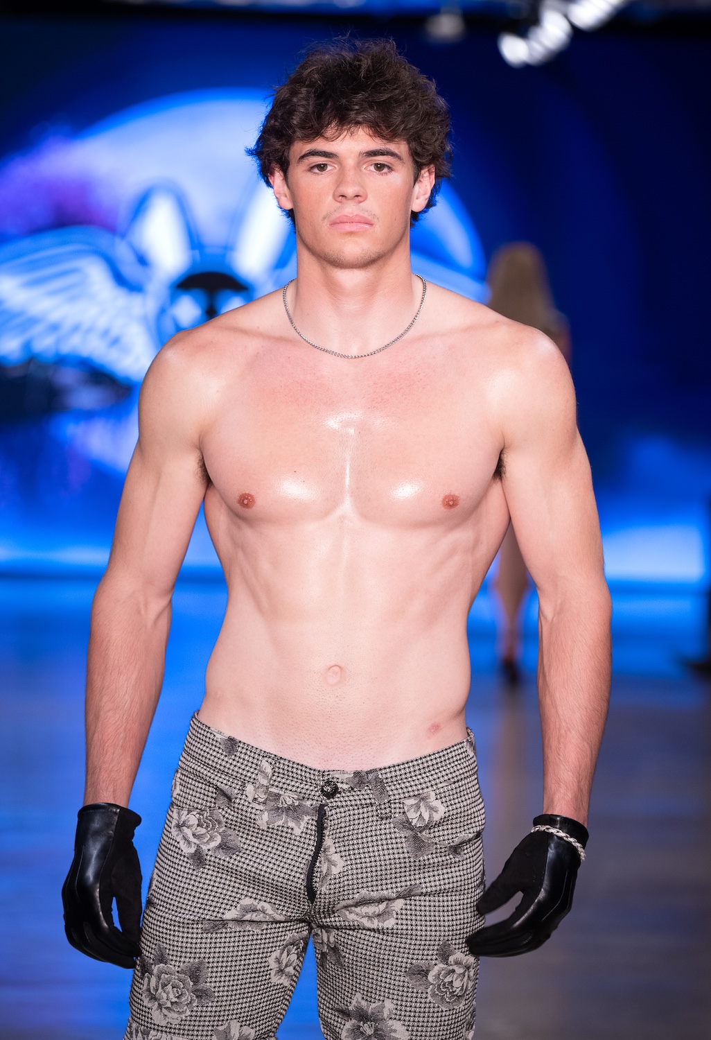 LOS ANGELES, CALIFORNIA - OCTOBER 18: Model Andrew Moroz walks the runway at the Mister Triple X show during Los Angeles Fashion Week Powered By Art Hearts Fashion at The New Mart on October 18, 2025 in Los Angeles, California. (Photo by Mark Gunter/Getty Images for Art Hearts Fashion)