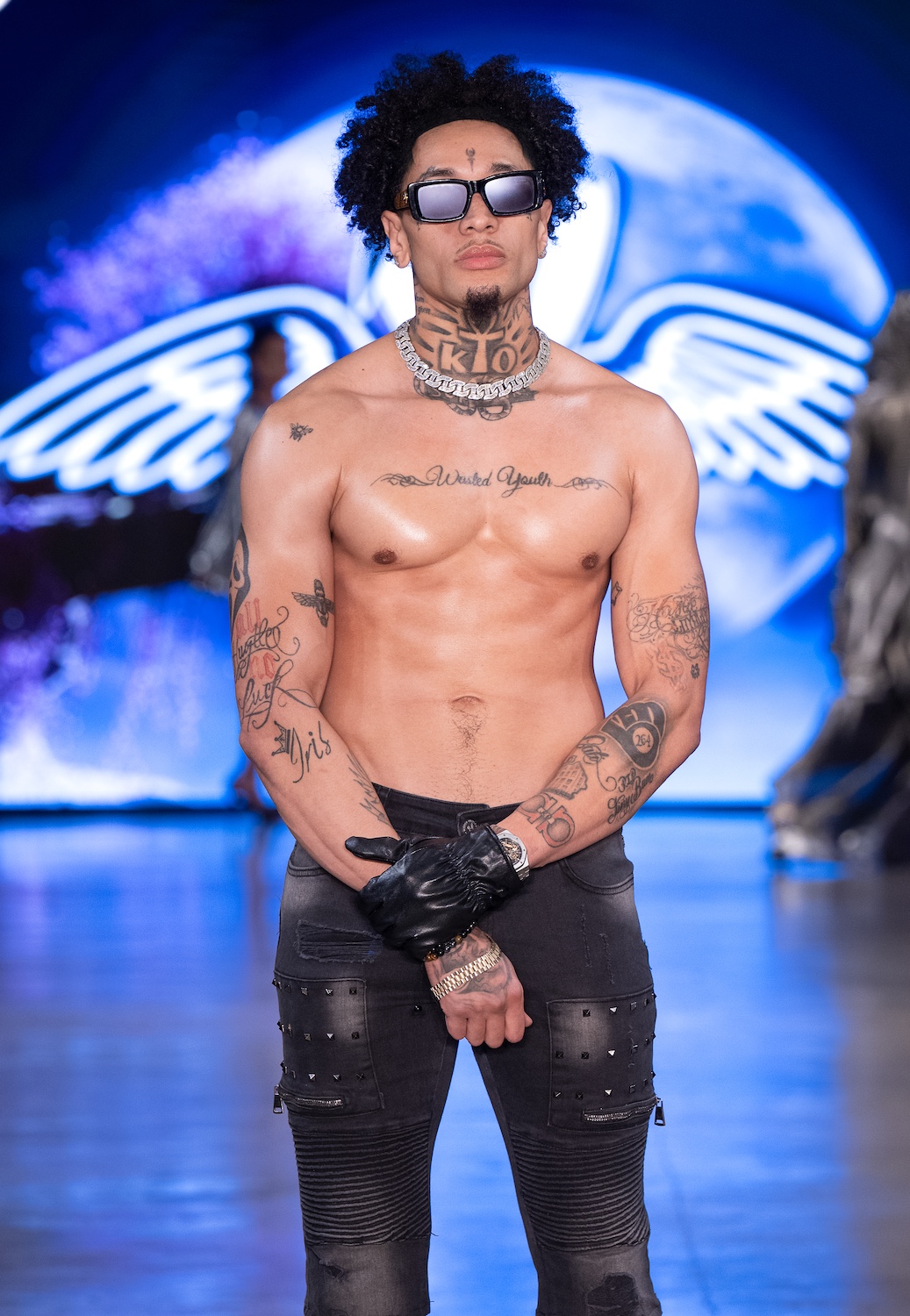 LOS ANGELES, CALIFORNIA - OCTOBER 18: Model Denzel Stone walks the runway at the Mister Triple X show during Los Angeles Fashion Week Powered By Art Hearts Fashion at The New Mart on October 18, 2025 in Los Angeles, California. (Photo by Mark Gunter/Getty Images for Art Hearts Fashion)