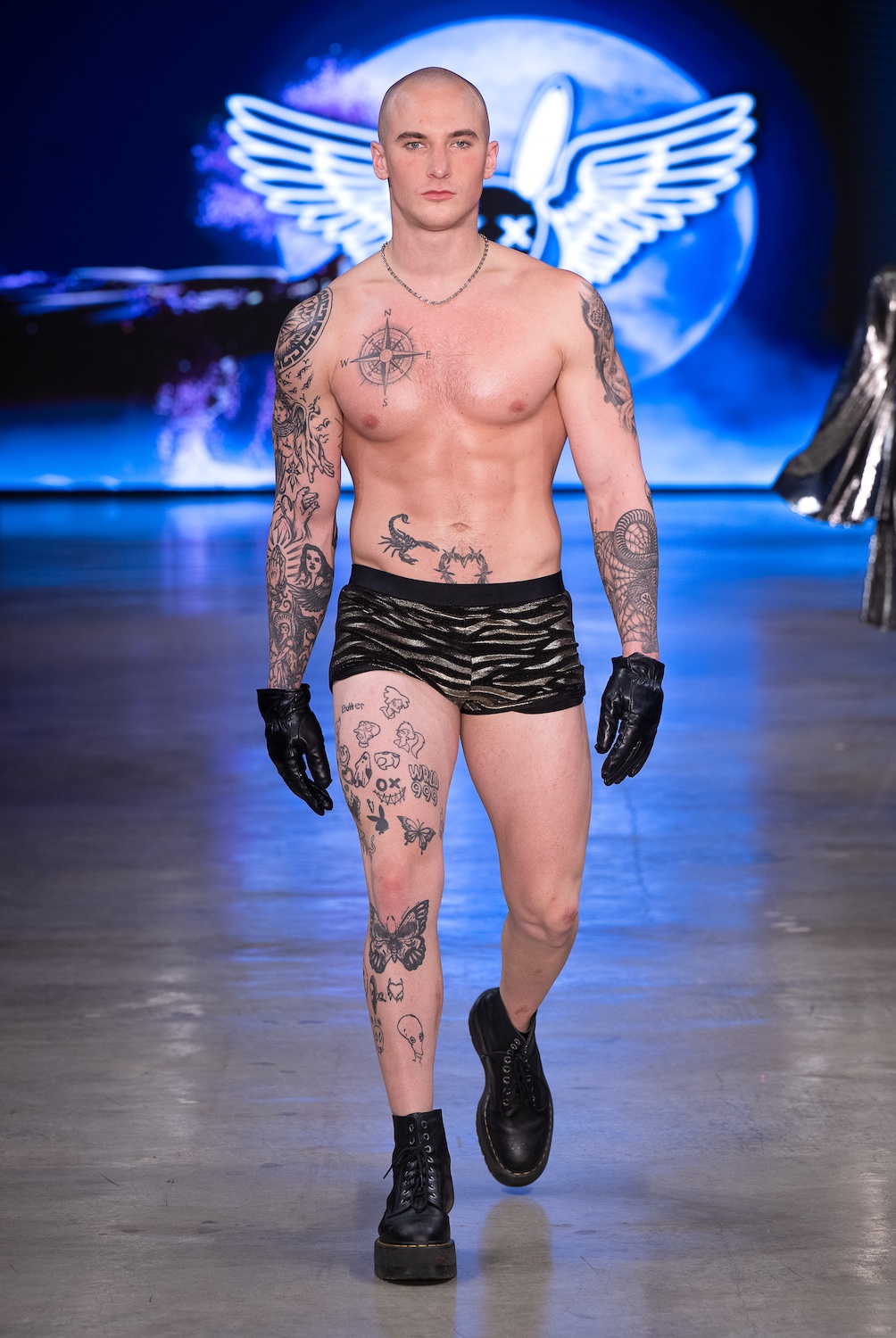 LOS ANGELES, CALIFORNIA - OCTOBER 18: Model Deven Breckener walks the runway at the Mister Triple X show during Los Angeles Fashion Week Powered By Art Hearts Fashion at The New Mart on October 18, 2025 in Los Angeles, California. (Photo by Mark Gunter/Getty Images for Art Hearts Fashion)