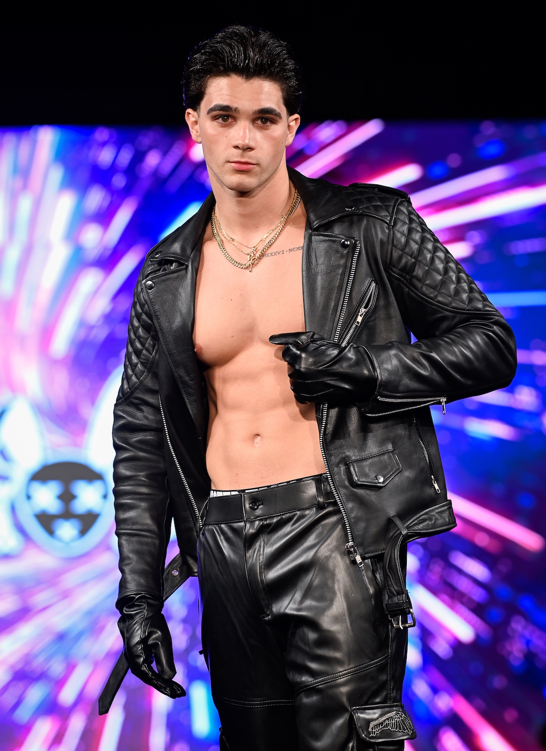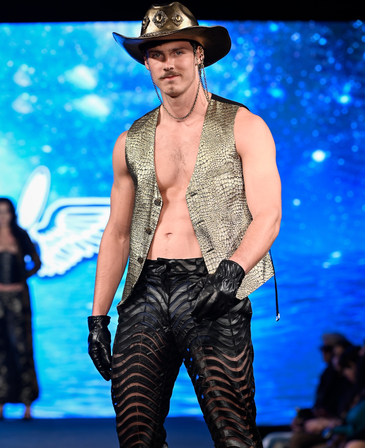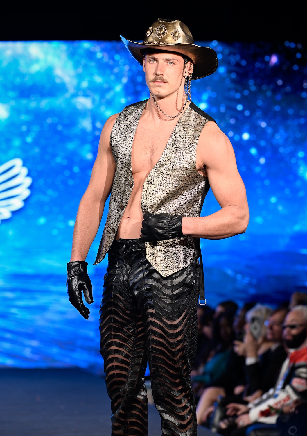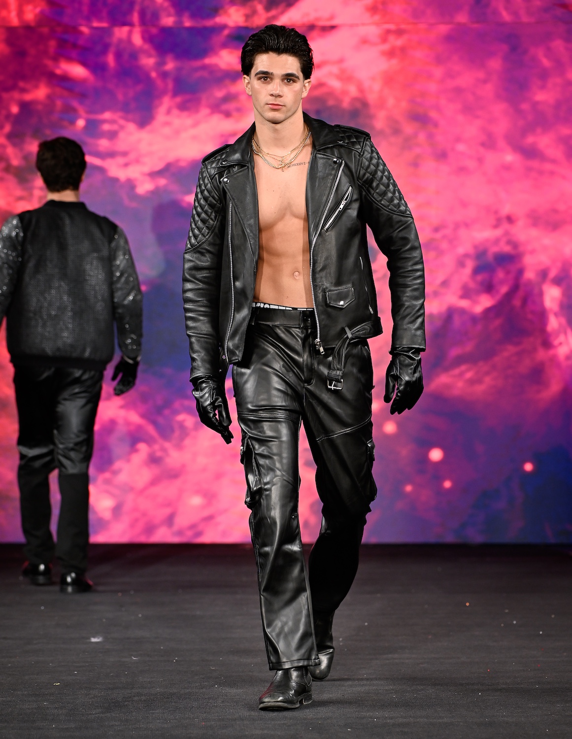 NEW YORK, NEW YORK - FEBRUARY 09: Model Colin Flynn walks the runway at the Chavelis Playhouse show during New York Fashion Week Powered By Art Hearts Fashion at The Angel Orensanz Foundation on February 09, 2025 in New York City. (Photo by Mark Gunter/Getty Images for Art Hearts Fashion)