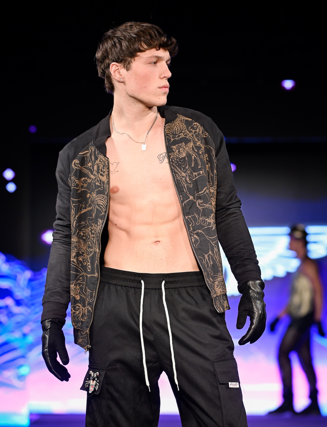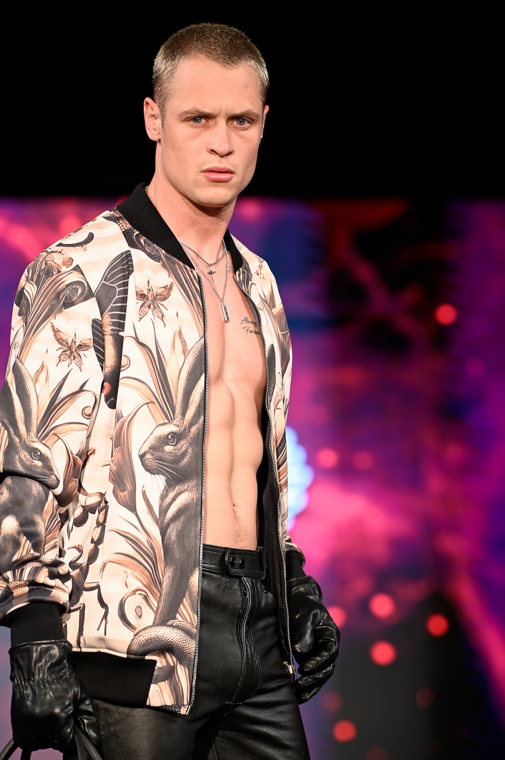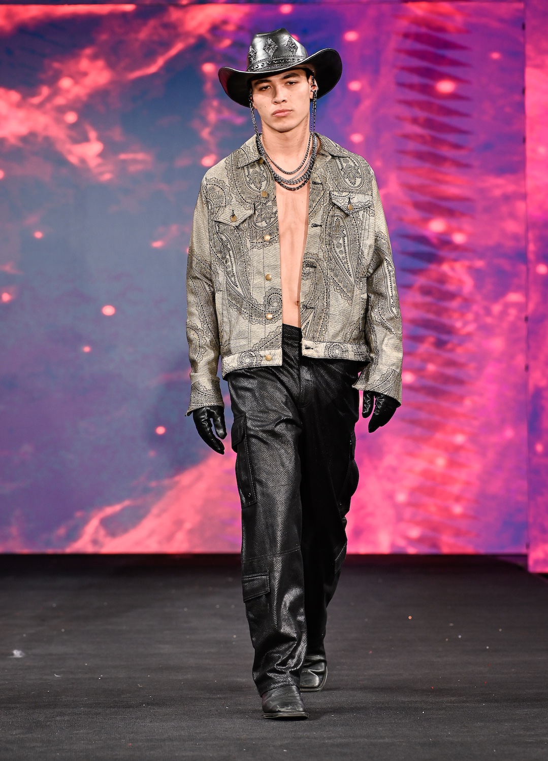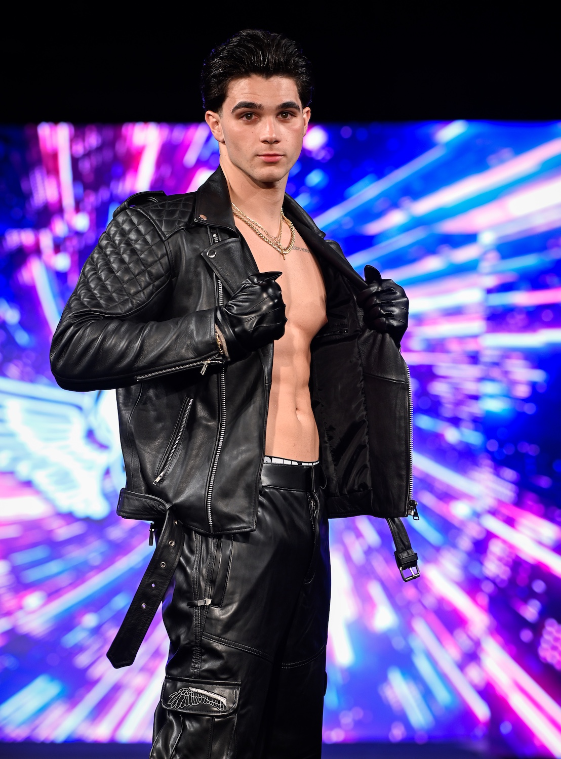 NEW YORK, NEW YORK - FEBRUARY 09: Model Colin Flynn walks the runway at the Chavelis Playhouse show during New York Fashion Week Powered By Art Hearts Fashion at The Angel Orensanz Foundation on February 09, 2025 in New York City. (Photo by Mark Gunter/Getty Images for Art Hearts Fashion)