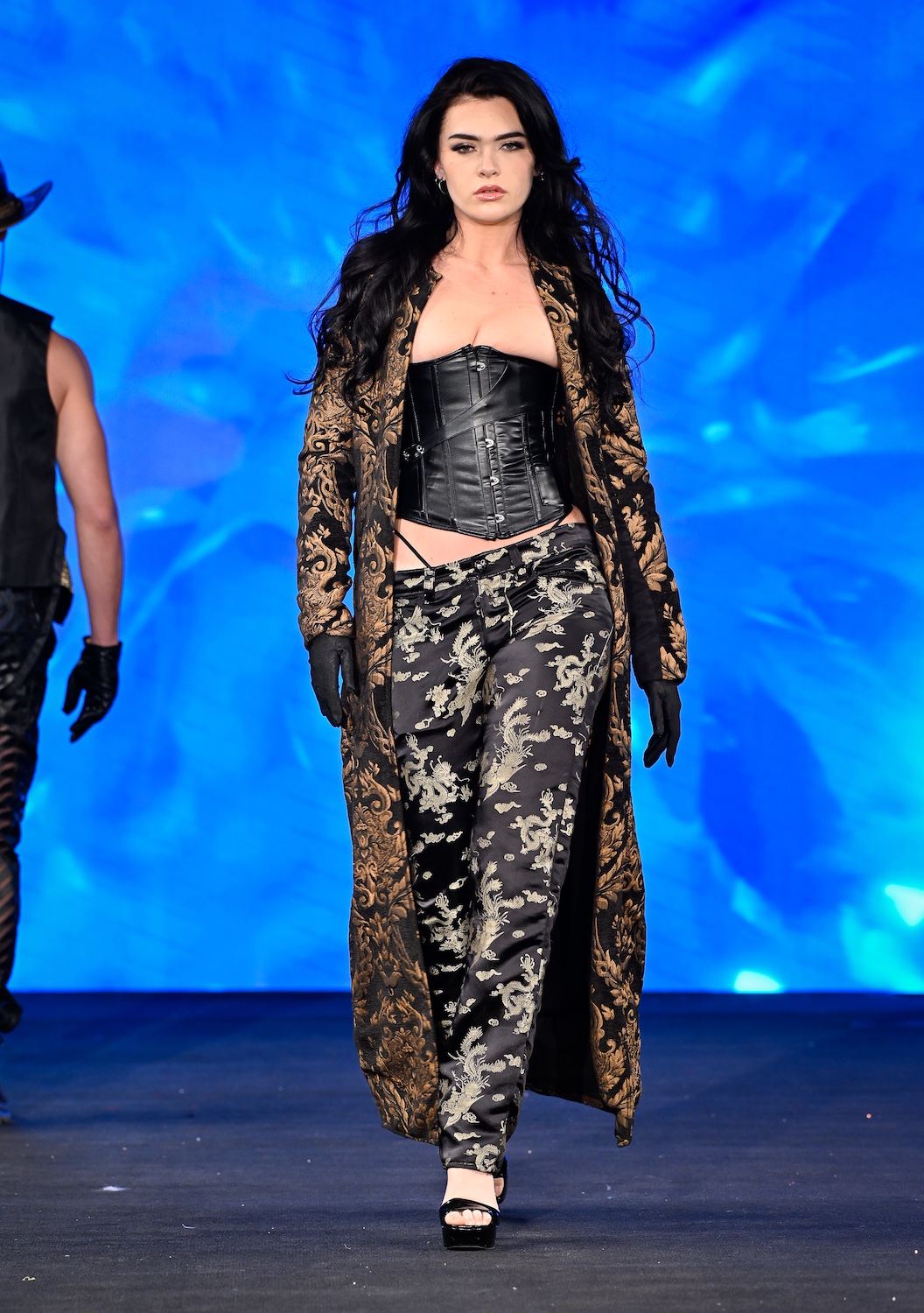 NEW YORK, NEW YORK - FEBRUARY 09: Model Abbie Artista walks the runway at the Black Tape Project show during New York Fashion Week Powered By Art Hearts Fashion at The Angel Orensanz Foundation on February 09, 2025 in New York City. (Photo by Mark Gunter/Getty Images for Art Hearts Fashion)