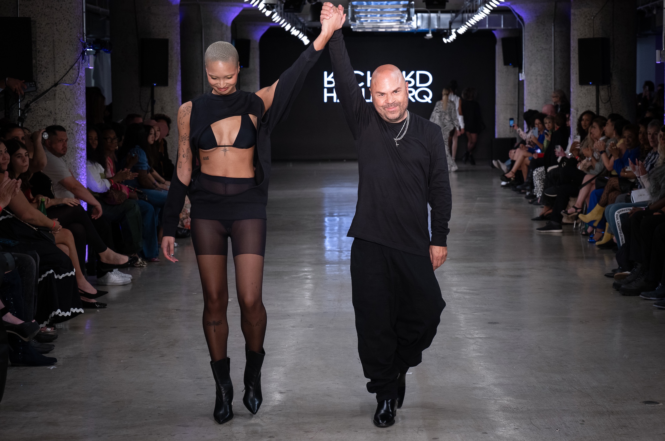 LOS ANGELES, CALIFORNIA - OCTOBER 18: Designer Richard Hallmarq and model walk the runway at the Richard Hallmarq show during Los Angeles Fashion Week Powered By Art Hearts Fashion at The New Mart on October 18, 2025 in Los Angeles, California. (Photo by Mark Gunter/Getty Images for Art Hearts Fashion)
